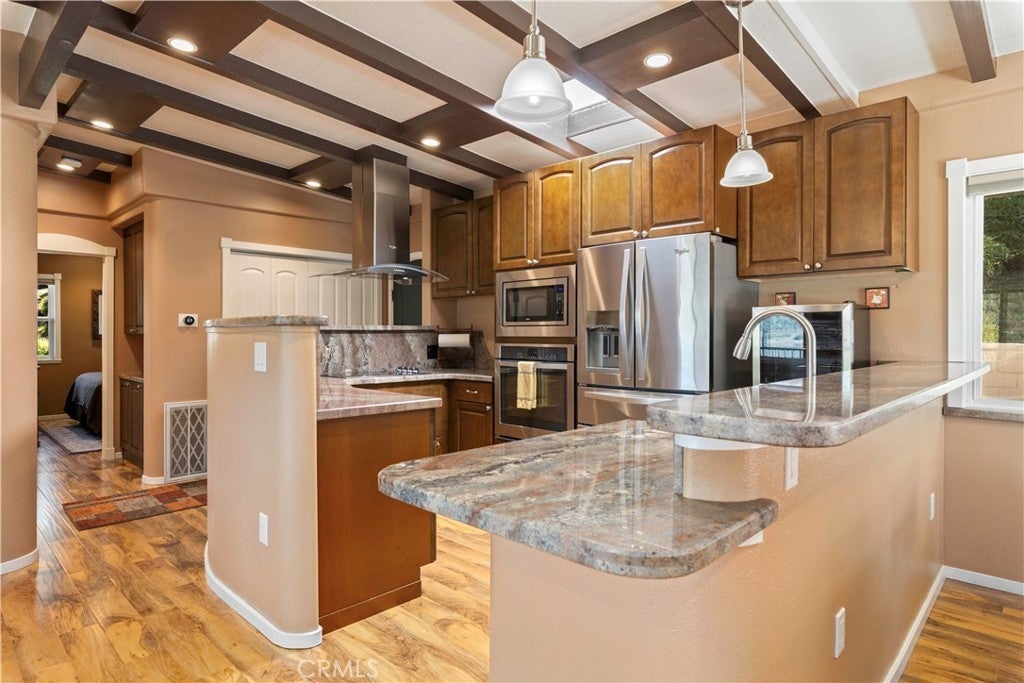 Turn-key and beautifully renovated, this lakeview retreat overlooks Soda Bay and is ready for your next getaway or full-time lake living. This 2-bedroom, 1-bath home has been thoughtfully updated from top to bottom, offering a fresh, modern feel with engineered hardwood flooring throughout, recessed lighting, and Milgard windows and sliders that bring in natural light and frame the stunning views. The open-concept kitchen is designed to impress, featuring custom cabinetry, granite slab countertops carried through to the bathroom, high-end stainless steel appliances, and a matching apron-front sink—all perfectly positioned to take in the lake beyond. Outdoor living is just as inviting, with a covered back deck finished in Trex-style composite decking—ideal for relaxing or entertaining while enjoying the scenery. The property includes deeded lake access shared with just five other homes, complete with a private pier, dock, and boat launch into Clear Lake, making it easy to enjoy life on the water. Additional features include fenced-in parking and parking under the attached carport, along with a private, tucked-away setting that still offers convenience—just about 10 minutes to town for shopping and dining, and a short drive to Konocti Harbor Resort. Connected to public water with a septic system, and offered fully furnished, with a boat, this home is truly move-in ready and perfectly positioned to enjoy the best of lake living!