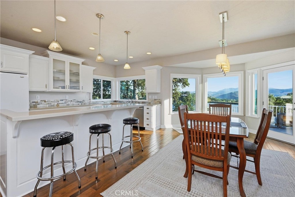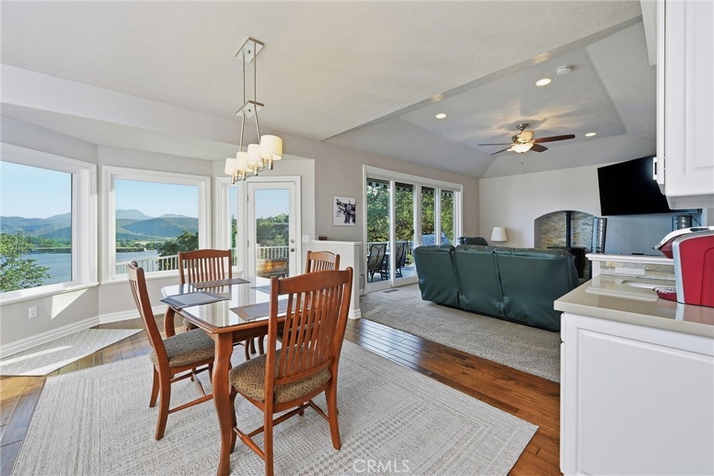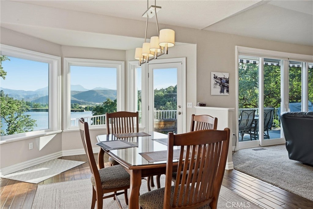 LAKEFRONT! Set along 170 feet of prime shoreline in Hidden Valley Lake, this beautifully updated 3 bedroom, 3 bathroom, 2,557 SF custom home offers a seamless blend of comfort, craftsmanship, and breathtaking views of Hidden Valley Lake with Mount St. Helena just beyond. Step through the inviting foyer, where natural light pours in through a dramatic wall of windows, immediately drawing your eye to the water. The main living space feels bright and open, designed to capture the views from nearly every angle. The gourmet kitchen is a true showpiece, featuring handcrafted cabinetry, quartz countertops, a newer induction stovetop range, recessed lighting, and two spacious pantries—perfect for both everyday living and entertaining. Just off the kitchen, the dining room offers a stylish wet bar with wine storage, creating an ideal setting for hosting. The primary suite is a private retreat, accessed through elegant French doors and highlighted by crown molding, a tray ceiling, custom built-ins, a cozy gas fireplace, and direct access to the deck. The en-suite bath offers a spa-like experience with tile countertops, a brick backsplash, and a Jacuzzi tub positioned to take in peaceful lake views. Downstairs, the versatile lower-level bonus room includes its own bathroom, wet bar, and private entrance—perfect for guests, extended stays, or potential in-law accommodations. Additional features include a spacious two-car garage with a recirculating hot water system with bonus room, owned solar with 2 power walls + EV charger for energy efficiency, and an expanded driveway providing ample additional parking. Outdoor living is just as impressive, with expansive TimberTech-style decking ideal for relaxing or entertaining while enjoying sunsets over the spillway. A gently winding path leads you to your boathouse and private dock—ready for kayaking, boating, and lakeside living at its finest.