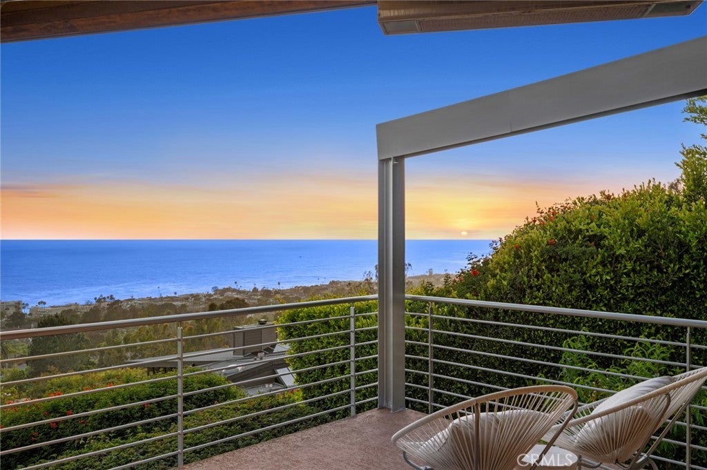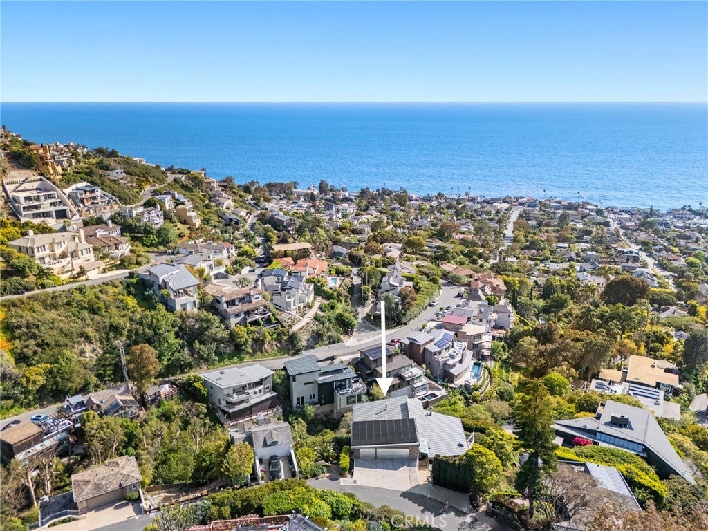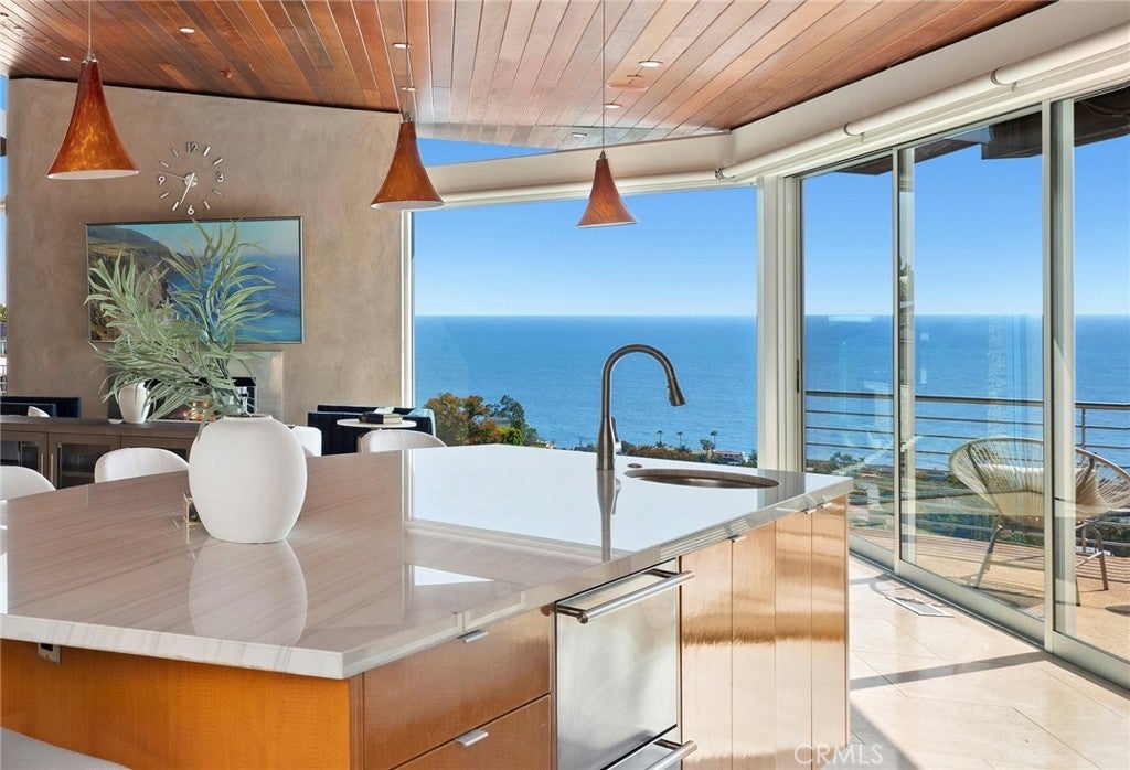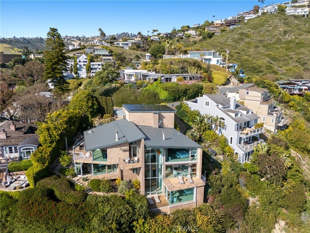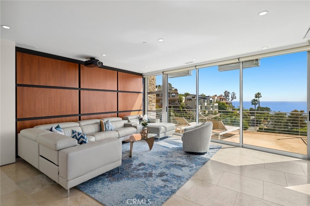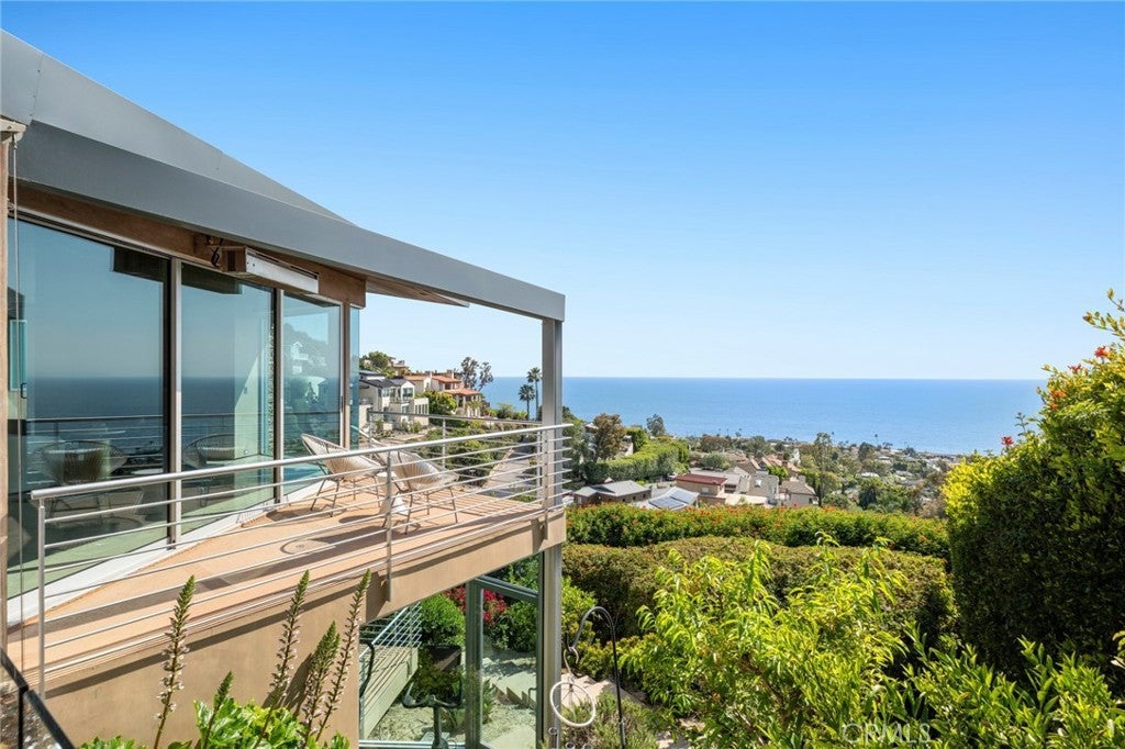 Welcome to a Mark Singer-designed sanctuary where modern sophistication meets coastal serenity. Perched in the highly sought-after enclave of Woods Cove, this one-of-a-kind 4-bedroom, 4,400 SF architectural marvel offers sweeping, unobstructed views of the Pacific Ocean, Catalina Island, and the pristine coastline of Laguna Beach. From the moment you step through the front door, you're enveloped in floor-to-ceiling ocean vistas, soft coastal breezes, and refined finishes that evoke the indulgence of a five-star resort. Thoughtfully upgraded with newly installed and fully owned Tesla solar panels, the home offers cutting-edge energy efficiency without compromising luxury. The main level hosts a breathtaking primary suite with expansive walls of glass framing the endless seascape and twinkling city lights. The spa-inspired ensuite bath features heated floors, vaulted ceilings, and timeless elegance. A true chef’s kitchen awaits with quartzite countertops and backsplash, a large central island, and top-tier appliances including a Hestan range, Liebherr refrigerator, Cove dishwasher, and built-in two-drawer refrigerator. A spacious walk-in pantry adds convenience and style. Seamless indoor-outdoor living is at the heart of this home, with a tranquil water feature leading to a large entertaining deck—ideal for sunset dinners or lively gatherings under the stars. The mid-level offers a second living area for entertaining, complete with a built-in projector, expansive ocean-facing deck, and a climate-controlled 800-bottle wine cellar—perfect for movie nights or intimate tastings. Each secondary bedroom suite is a private retreat, featuring its own terrace, entrance, and coastal views. One room also doubles as a creative studio or home office. A distinctive staircase adds architectural flair, capturing sunlight and ocean sparkle by day and golden sunsets by night. Practical luxury continues with a generous three-car garage and a full driveway, ideal for guests and car collectors. And with fully owned Tesla solar, you’ll enjoy sustainable living with reduced energy costs—without sacrificing comfort. This is more than a home; it's a lifestyle—a rare opportunity to live above the waves in timeless style, just moments from world-class beaches, restaurants, boutique shopping, and the vibrant Laguna Beach art scene.