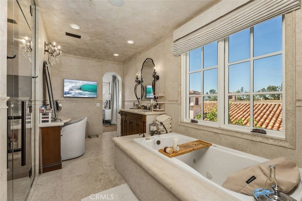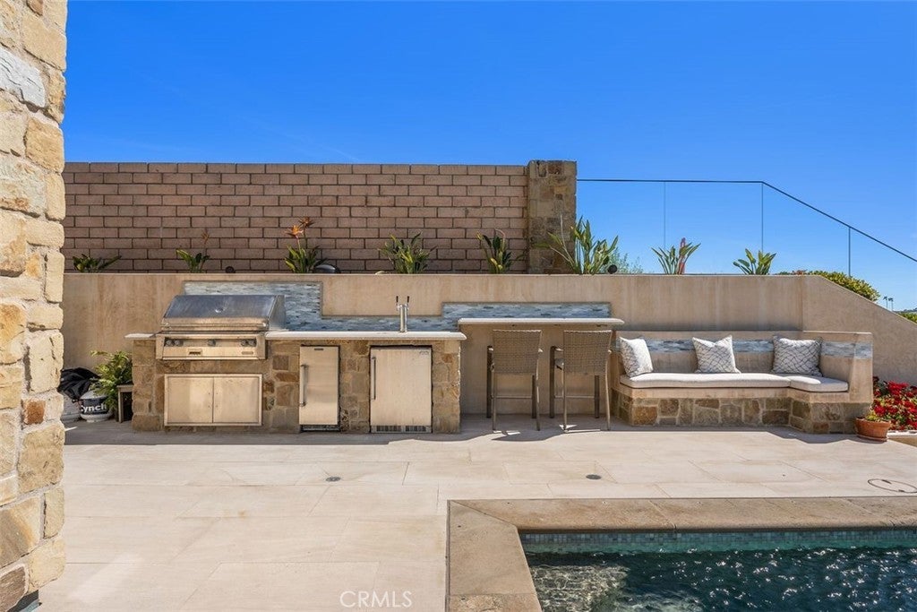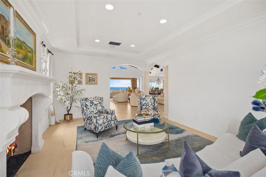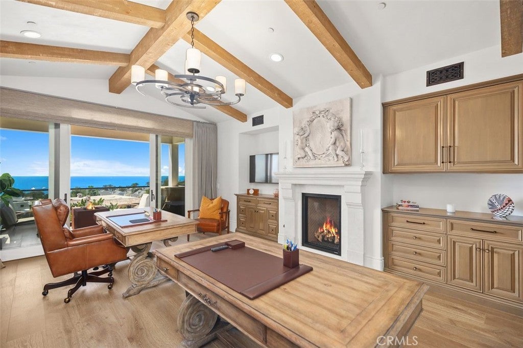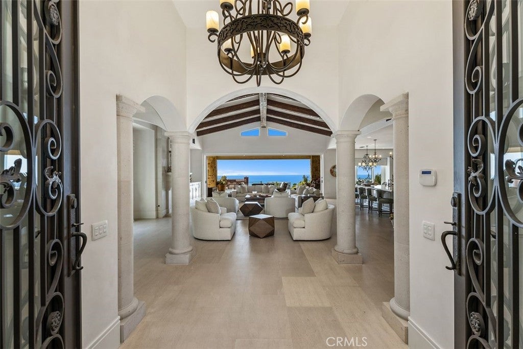 Escape to your own true resort-caliber estate in this elegantly timeless villa, exquisitely crafted in the Mediterranean style and offered **fully furnished** in California's most exclusive guard-gated oceanfront community, The Strand at Headlands. Breathtaking ocean views abound throughout this private retreat, which is graced with bespoke amenities such as an ocean-view salt water infinity pool and spa, stone loggia, sprawling entertaining terrace with outdoor fireplace, fitness/massage room with dry sauna and steam, huge game room with custom billiards table and an 18' full bar, walk-in wine cellar/tasting room, home theater room, outdoor cooking area, and privately gated front courtyard. The property underwent a complete restoration in 2024. The sweeping great room opens the kitchen to formal dining and sitting areas, and features stone floors, colonnades, and barrel-vaulted and beamed ceilings. The kitchen is well-appointed, with multiple sinks, dishwashers and refrigerators, double oven, an oversized stone island bar, a butler's pantry, secondary dining area and ample storage cabinets. The primary suite features 2 view balconies, separate lounge/office, lavish double bathroom, 2 walk-in closets, tray ceiling, and fireplace. All of this is orchestrated on a grand scale encompassing 5 bedrooms and 8.5 baths – over 9,000 square feet – with 4 garage spaces, 5 fireplaces, 4 balconies, multiple water features, and gardens spanning an oversized lot. Very high ceilings and slide-away glass doors invite natural light throughout the day. Discerning visitors will appreciate the meticulous craftsmanship of this fine home, with custom furniture curated for every indoor and outdoor space. All furnishings are new and were installed by Andrea Bruley Designs or sourced directly by owner. The renowned Strand at Headlands community, one of the most affluent gated neighborhoods in the world, offers an oceanfront clubhouse and pool, private beach lockers, walking and biking trails, and golf-cart parking behind private gates. It is in very close proximity to Dana Point's recently renovated Lantern District, and also Dana Point Harbor, currently being revitalized to be one of the most vibrant marine districts on the west coast.