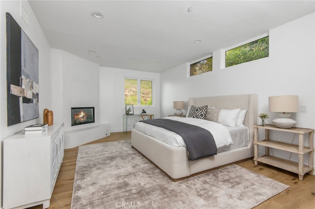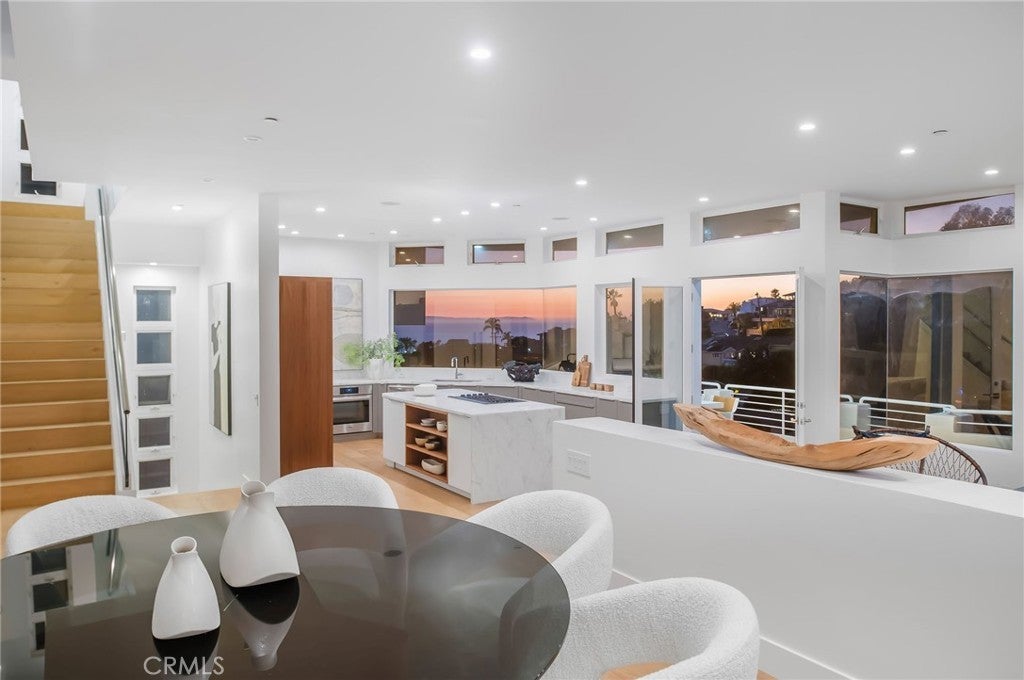 A stunning example of contemporary Laguna Beach architecture with panoramic views of the Pacific Ocean and the city below. This highly updated home spans approximately 4,256 square feet across four levels and features five bedrooms in addition to multiple outdoor spaces. The living space, dining area, and kitchen flow seamlessly to create a large, voluminous great room just off the main entryway. Multiple windows perfectly frame the ocean views and let in abundant light. The recently renovated kitchen features two-tone cabinetry, a suite of Bosch appliances, and a waterfall-edge marble island with a cooktop. A large patio off the living area allows for alfresco dining, while the fireplace with a modern concrete mantle anchors this airy space. The primary suite spans the entire top floor, with walls of Pacific-facing windows, a sizable balcony, and a massive walk-in closet. The remodeled owners’ bathroom is grand and features a standalone tub, a seamless dual shower, and floating vanities. Another of the home’s fireplaces rounds off this floor. All secondary bedrooms are located on lower levels, granting their occupants ultimate privacy. A junior suite with an adjacent five-piece bath and walk-in closet shares the floor with another of the home’s decks and two additional bedrooms connected by a jack-and-jill bathroom. The lowest level houses a large flex space with its own entrance, which lives like an ADU - with a kitchenette and a full bath. Dream location, with Laguna’s shopping, galleries, and famed beaches just minutes away.