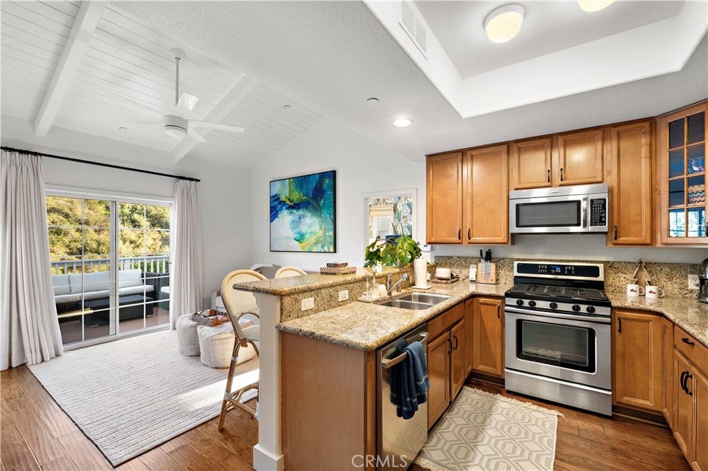 - Interior FeaturesBreakfast Bar, Beamed Ceilings, Furnished, Granite Counters, Living Room Deck Attached