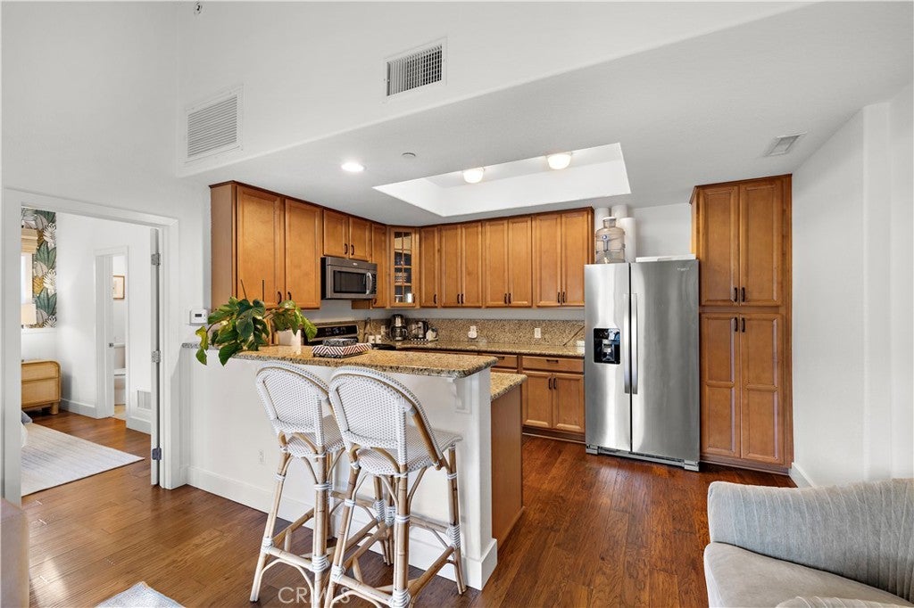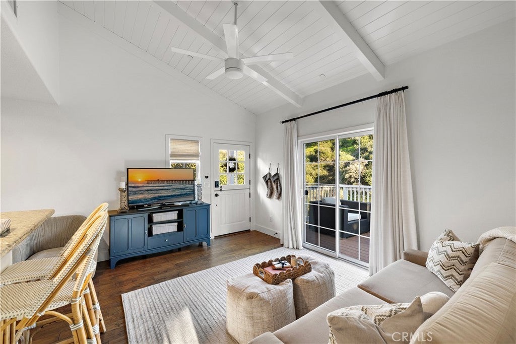 Available June-July 15 2026! Experience the quintessential Laguna Beach lifestyle in this stunningly remodeled, fully furnished 1-bedroom, 1-bathroom retreat. Tucked away on a quiet street in lower Temple Hills, this light-filled unit features a perfect blend of coastal tranquility and modern comfort making it the ideal sanctuary for your stay. Enter through the charming Dutch door to find rich hardwood-style flooring, a cozy living room with a large skylight that floods the space with natural light and sliding glass doors that open to a private balcony surrounded by lush greenery—perfect for enjoying the ocean breeze. The gourmet kitchen is fully equipped for the home chef, featuring warm wood cabinetry, granite countertops, stainless steel appliances, and a breakfast bar with woven bistro seating. Retreat to the spacious bedroom which continues the airy feel with high ceilings and a ceiling fan. This relaxing haven is tastefully decorated with a tropical botanical accent wall, a plush blue velvet upholstered bed, and a chic sitting bench. The bathroom offers a spa-like atmosphere with floor-to-ceiling travertine tile and a walk-in shower. With mirrored wardrobe doors, ample storage, and laundry access, this beautiful unit offers everything you need to live like a local in one of Southern California's most desirable coastal enclaves.