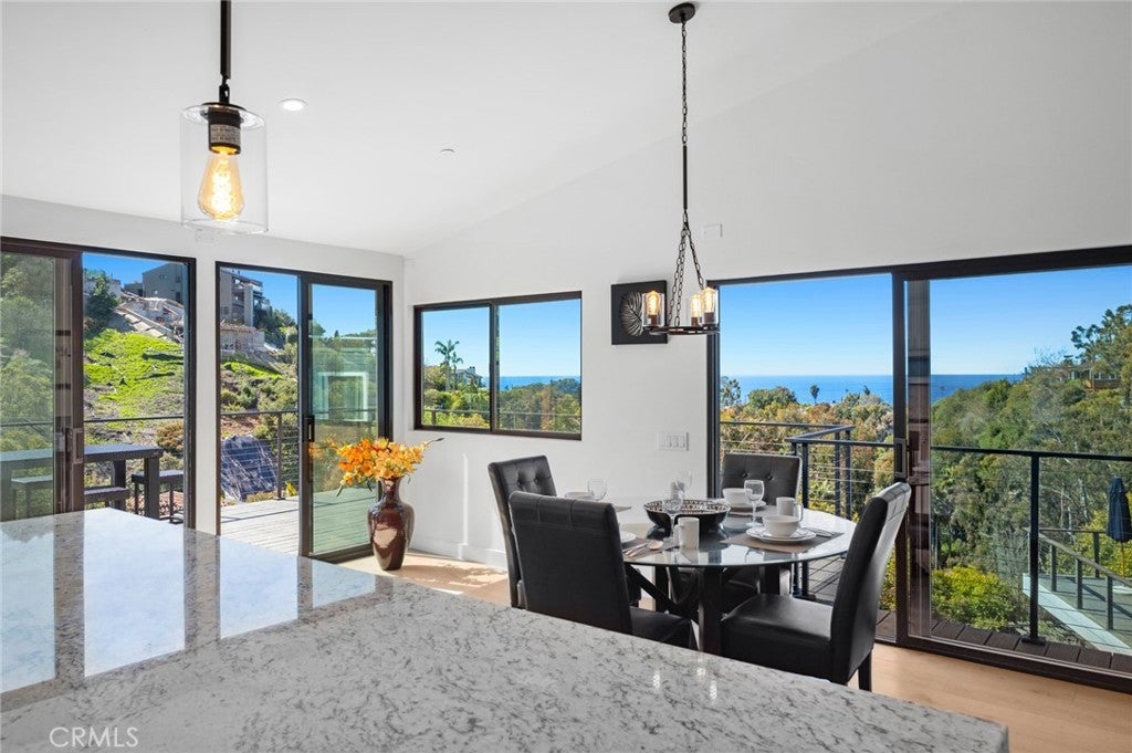Embraced by a beautiful setting with ocean and canyon views on a cul-de-sac homesite, this spectacular single-level, fully upgraded residence effortlessly blends indoor-outdoor living in a delightful environment that enhances every aspect of your lifestyle. Enjoy relaxed days, special moments, and unforgettable occasions with the ones you love in an open and inviting design that offers three bedrooms and two bathrooms across approximately 1,286 square feet. This open-concept home, upgraded in 2024, provides the perfect backdrop for coastal living, starting with an inviting oversized ocean-view front deck that sets the tone. Inside, a beautifully arranged dining, kitchen, and family area is designed for both elegance and ease. Vaulted ceilings and brand-new Milgard windows frame sweeping views, extending from the fireplace-warmed living room to the coastal-view dining space—an ideal setting for entertaining. The expansive wraparound deck continues the living experience outdoors, where vibrant sunsets and Catalina Island views create a truly magical ambiance. The chef’s kitchen is both functional and refined, featuring stone countertops, custom cabinetry, and a center island with charming breakfast seating. High-end Bosch appliances, including a built-in 6-burner range, complete the space seamlessly. The tranquil primary suite offers a peaceful retreat with a luxurious bath that includes a double vanity, a tub, and a separate shower. Two additional bedrooms and a bathroom, with a walk-in shower, provide comfort and flexibility for guests or family. Bathed in natural light and cooled by gentle ocean breezes, the home also boasts extensive upgrades, including all-new plumbing and electrical systems, a new roof, a new HVAC system, a new tankless water heater, and an electric car charger. Ample parking is available in the driveway, located just beyond the two-car garage. This gorgeous, move-in-ready home is just moments from the upscale boutiques, galleries, cafés, and restaurants of Laguna Beach’s vibrant Village. Pristine beaches, romantic coves, and scenic hiking trails are nearby, enriching a coastal lifestyle that you’ll treasure for generations to come.