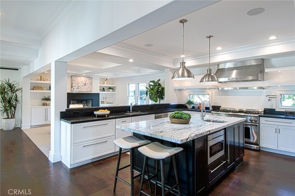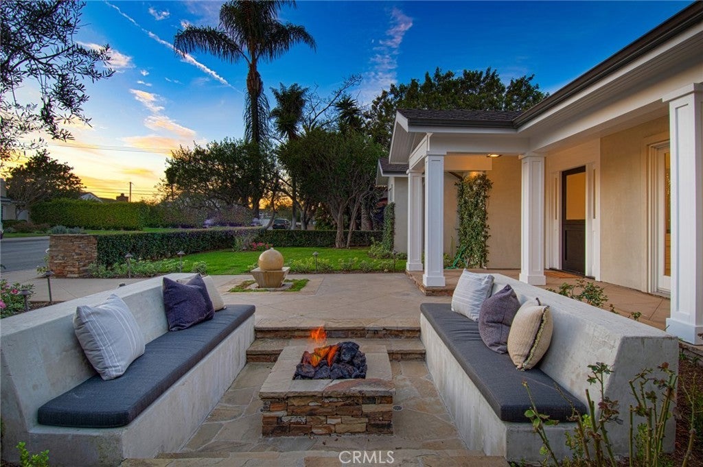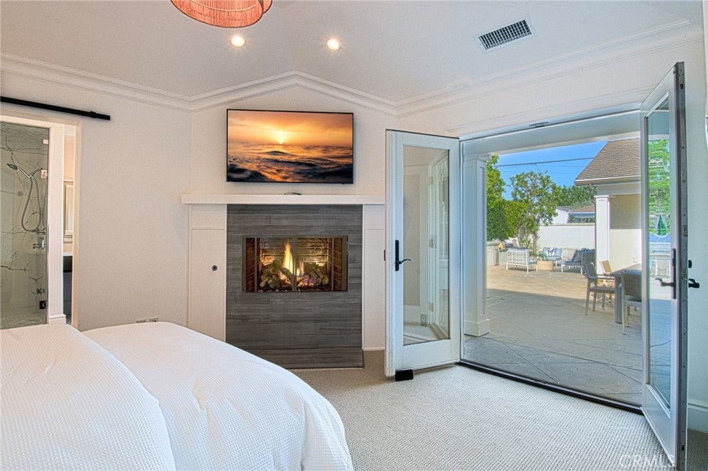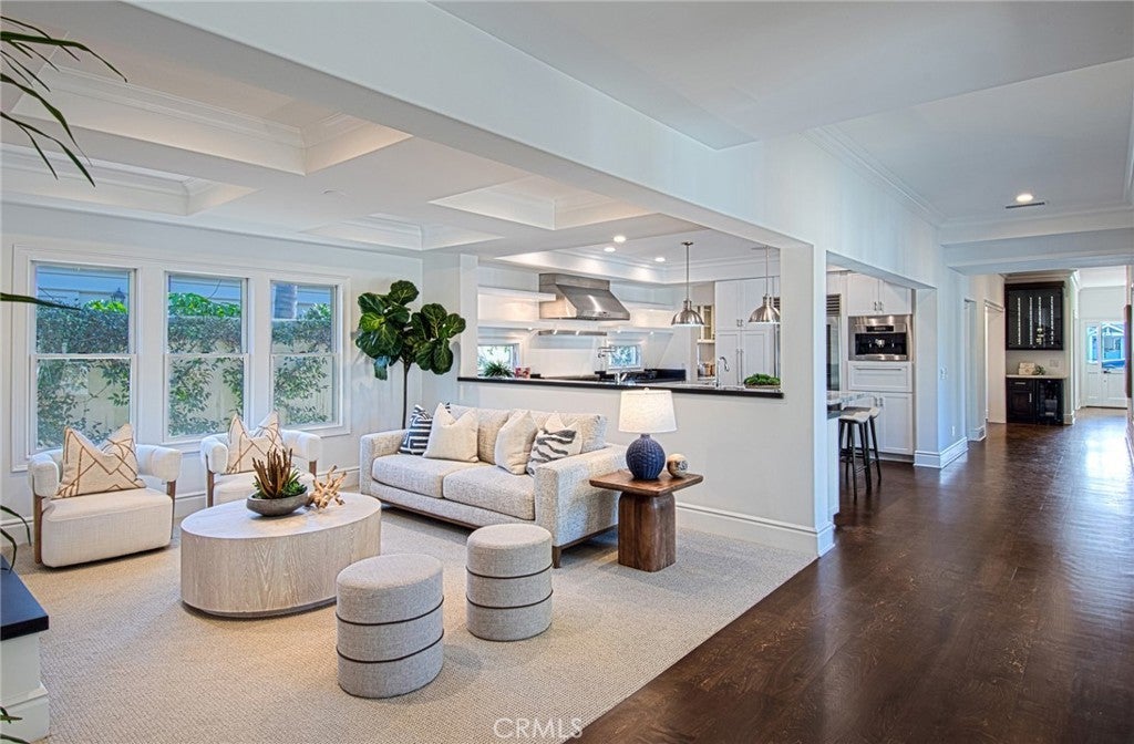 This captivating single-story contemporary home is impeccably designed and richly appointed throughout. A welcoming front courtyard sets the tone with a tranquil water feature, gas fire pit, and meticulously curated landscaping. Designed for both everyday living and effortless entertaining, the gourmet kitchen is outfitted with top-of-the-line stainless steel appliances, including a six-burner Thermador range, Thermador refrigerator, and a built-in Miele espresso machine. Granite countertops and an expansive marble center island—complete with an additional dishwasher, prep faucet, and pull-out refrigerator—anchor the space. The kitchen flows seamlessly into a butler’s pantry with a wine refrigerator, connecting to a refined dining area and an elegant living room featuring coffered ceilings, with a gas fireplace, and a state-of-the-art entertainment sound system. Throughout the home, notable appointments include coffered ceilings, beautiful newly refinished maple hardwood floors, crown moldings, custom built-in cabinetry, recessed lighting, and with an abundance of natural light streaming through numerous windows and glass doors. French doors open to a spacious, private outdoor entertaining retreat highlighted by a spa with water feature, a custom pizza oven, and a built-in grill—perfect for outdoor gatherings. The luxurious primary suite offers a walk-in closet, fireplace, and a beautifully remodeled spa-inspired bathroom featuring a pedestal soaking tub, modern bidet, and a large walk-in steam shower. The secondary bedrooms are spacious, offer ample closet space and recently upgraded bathrooms. A bedroom with separate exterior access and adjacent to the garage could be used as an office, gym, or perfect for interim guests. Other noteworthy elements of the property include a bocce ball court, rear access that affords storage of additional vehicles, as well as fresh interior and exterior paint. Ideally located near the shops and restaurants of 17th Street, Mariner’s Park and award-winning Mariners Elementary School, this exceptional home combines refined design with an unbeatable location.