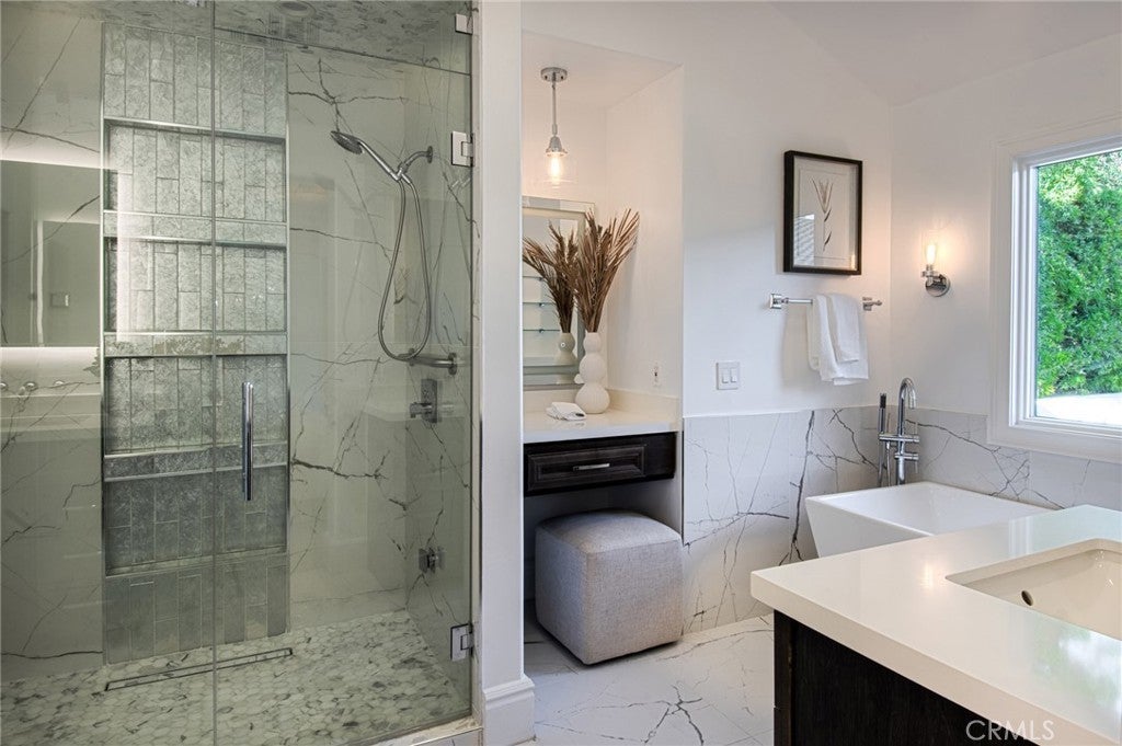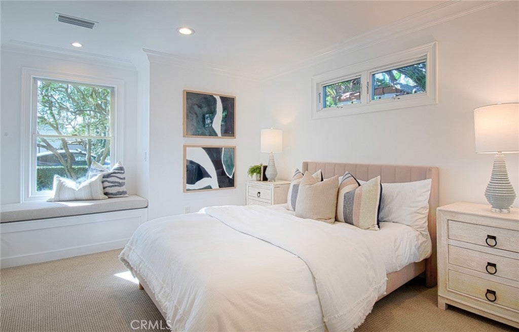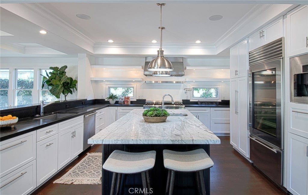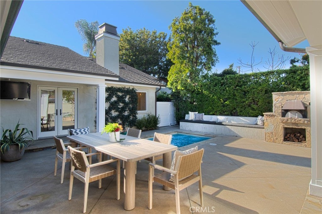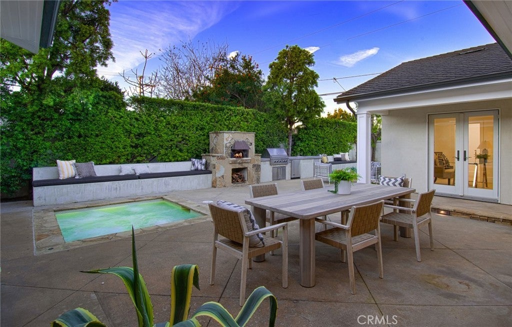This captivating single-story contemporary home is impeccably designed and richly appointed throughout. A welcoming front courtyard sets the tone with a tranquil water feature, gas fire pit, and meticulously curated landscaping. Designed for both everyday living and effortless entertaining, the gourmet kitchen is outfitted with top-of-the-line stainless steel appliances, including a six-burner Thermador range, Thermador refrigerator, and a built-in Miele espresso machine. Granite countertops and an expansive marble center island—complete with an additional dishwasher, prep faucet, and pull-out refrigerator—anchor the space. The kitchen flows seamlessly into a butler’s pantry with a wine refrigerator, connecting to a refined dining area and an elegant living room featuring coffered ceilings, with a gas fireplace, and a state-of-the-art entertainment sound system. Throughout the home, notable appointments include coffered ceilings, beautiful newly refinished maple hardwood floors, crown moldings, custom built-in cabinetry, recessed lighting, and with an abundance of natural light streaming through numerous windows and glass doors. French doors open to a spacious, private outdoor entertaining retreat highlighted by a spa with water feature, a custom pizza oven, and a built-in grill—perfect for outdoor gatherings. The luxurious primary suite offers a walk-in closet, fireplace, and a beautifully remodeled spa-inspired bathroom featuring a pedestal soaking tub, modern bidet, and a large walk-in steam shower. The secondary bedrooms are spacious, offer ample closet space and recently upgraded bathrooms. A bedroom with separate exterior access and adjacent to the garage could be used as an office, gym, or perfect for interim guests. Other noteworthy elements of the property include a bocce ball court, rear access that affords storage of additional vehicles, as well as fresh interior and exterior paint. Ideally located near the shops and restaurants of 17th Street, Mariner’s Park and award-winning Mariners Elementary School, this exceptional home combines refined design with an unbeatable location.
