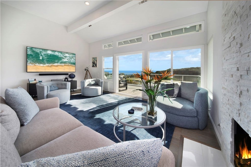 Panoramic and sweeping ocean views greet as you step into this Coastal Gem situated on prime lot in the gated community of Regatta of Monarch Beach/Dana Point. Perfectly perched above the Dana Point Harbor, Lantern District and the Strand at the Headlands, this property captures amazing ocean views to the north to Catalina Island and to the south to the coastline of Capistrano Beach, San Clemente and beyond. A gated Courtyard entry leads you to this ocean-close resort destination property on cul-de-sac street. The "open-concept" floorplan seamlessly embraces a fun and festive design ready for entertaining and enjoying the breathtaking "sit-down" ocean views. Tall windows open to the expansive deck with ocean view from the living room complete with fireplace and bar. Two skylights and a multitude of windows showcase the light and bright architectural details of this "chic" beach haven. The Chef's kitchen with "quartz' counter tops, stainless steel appliances and Wolf commercial-style gas stove opens to the dining room area. Downstairs, the spacious and secluded primary suite encompasses the entire lower floor complete with sitting area, fireplace, lavish remodeled bath with separate tub and shower, dual vanity sinks and walk-in finished closet. Upstairs, the home spotlights two large secondary bedrooms, one with peek ocean view and sunset view while the other highlights a sunroom alcove with sunrise view. The secondary bath has been remodeled. This property boasts hardwood flooring throughout, except baths, two fireplaces, new exterior paint, a large back yard and patio area complete with gas BBQ and ocean and sunset views, dwarf lemon and lime trees, custom lighting, an attached 2 car-garage with driveway and garage Tesla car charger, and a nearby Community Club area complete with pool and spa. The historical City of Dana Point of "Whale-Watching" fame, harbor and marina, cafes and fine dining, shops, the infamous Salt Creek Beach, 5-Star luxury hotels and the Links Golf Course, plus the Art Colony of Laguna Beach are all just minutes away. Embrace the superb coastal lifestyle from this perfectly positioned dream location ready for weekend BBQ's and enjoying the Catalina Island sunsets, a morning at the beach, or just relaxing and enjoying resort-style living all year around.