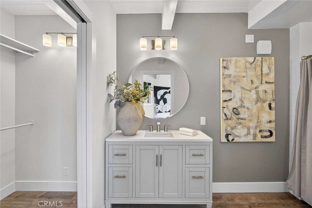 - Interior FeaturesBeamed Ceilings, Breakfast Bar, Built-in Features, Balcony, Breakfast Area, High Ceilings, Living Room Deck Attached, Open Floorplan, Quartz Counters, Bedroom on Main Level, Dressing Area, Main Level Primary, Primary Suite, Walk-In Closet(s)