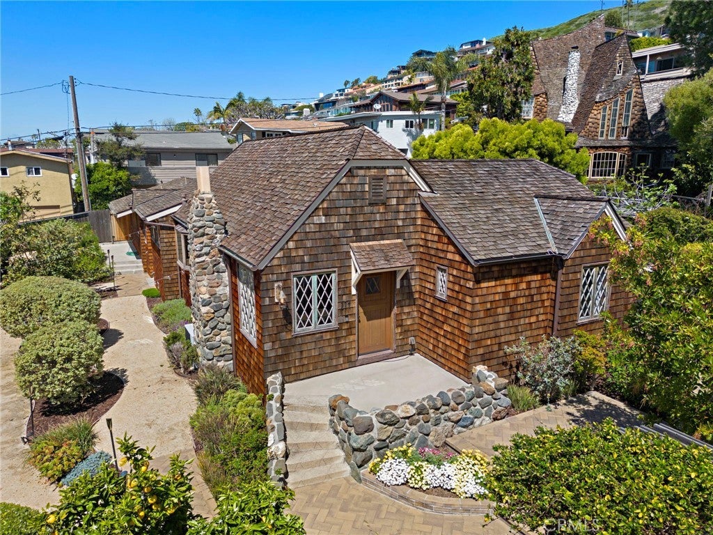 Stunning story book cottage on a rare double lot with spacious side yard and ocean view. Charming historic reconstruction all on a single level featuring vintage details throughout, tons of windows bringing in the light, open living room with vaulted wood ceilings and a cozy fireplace, exposed beams, gourmet kitchen with two-toned custom cabinets, appliances include refrigerator, dishwasher, wall oven, and gas cooktop, quartz counters and farmhouse sink, formal dining area, luxurious primary ensuite with antique vanity, claw-foot tub and spa shower, two large secondary bedrooms and another gorgeous guest bath, all highlighted with European oak flooring throughout. Secluded back patio with pergola and outdoor shower, massive side garden area creating a phenomenal outdoor living and entertaining space, plus in addition to the two car garage, there is an extra private parking area for 2+ cars off the back alley. You will love living within two blocks of one of Laguna's best beaches, Shaw's Cove, just north of the Laguna Artist Colony, it is the most desirable part of town. Conveniently located within walking distance to shopping, restaurants and galleries or hop on the local trolley to enjoy the festivals or coastal resort properties. This is a must see one of a kind property, a simply wonderful place to call home!