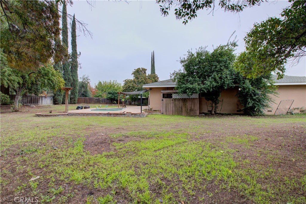 This treasure is located in a court in the very desirable North Merced, Wainwright Bear Creek Neighborhood. A well cared for original. This home features 3 bedrooms and 2 bathrooms, new paint and newer carpet, a formal dining/living room, a separate family room with a beautiful feature brick fireplace framed by bookcases, and a bonus room with open beamed ceiling and gorgeous plantation shutters. Kitchen has spacious cabinetry, Corian counters and an illuminating skylight. Great-sized bedrooms with spacious closets. Rear yard is big and beautiful, with numerous trees - ready for you to create your own paradise. It has 27 solar panels that will be paid off by COE. It has a relaxing, built-in mini-pool/spa, surrounded by a durable Trex deck. Dual pane windows and ceiling fans throughout the home.
