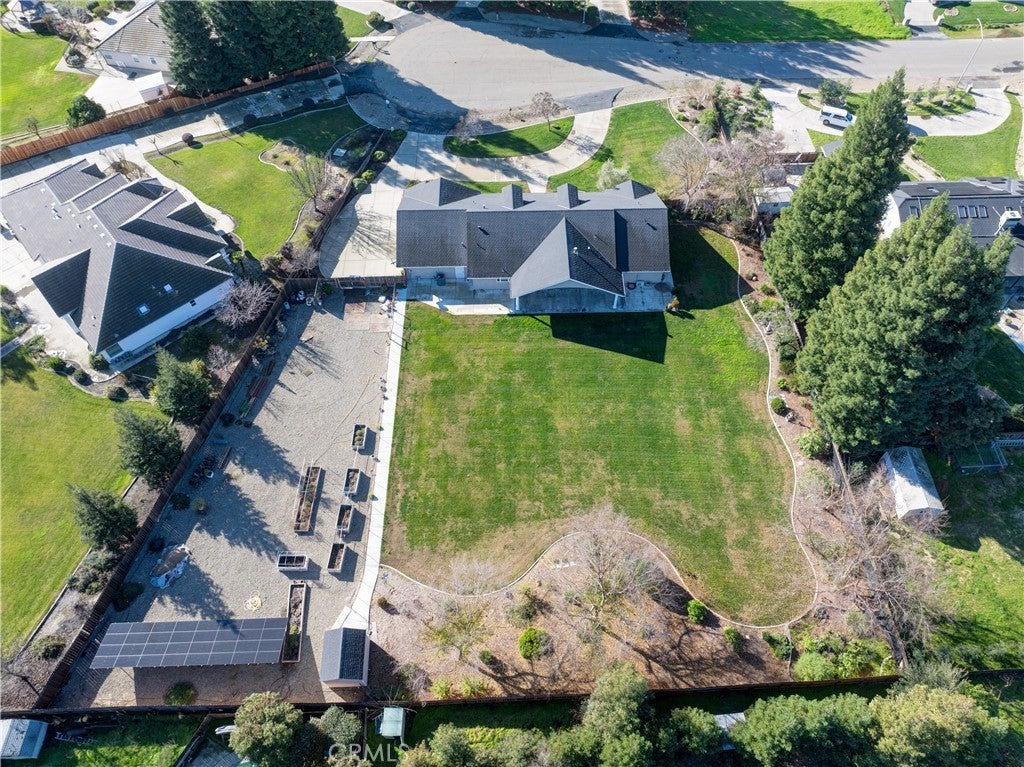 Beautifully upgraded 4-bedroom, 2.5-bath residence set on an expansive 1.15-acre parcel, welcoming you with a circular driveway, manicured grounds, and mature trees that create a serene, estate-like atmosphere. Inside, enjoy vaulted ceilings, a spacious open-concept family room with a stone-accented gas fireplace, and a thoughtfully designed layout ideal for everyday living. The chef’s kitchen, updated within the last few years, showcases quartz countertops, a large farmhouse sink, soft-close cabinetry, and stainless steel appliances including a Thermador 5-burner gas cooktop, Café double oven with air fryer, refrigerator, and Zephyr hood, anchored by an island with breakfast bar. A formal dining room with crown molding, skylight, built-in hutch, and wine bar adds an elevated touch. The primary suite is a true retreat, featuring outdoor access, a generous walk-in closet, and a spa-inspired bath with a fully tiled jacuzzi tub, walk-in shower, double sinks, and heated towel rack. Additional bedrooms offer comfort with carpeted floors and double door closets. The laundry room features tiled flooring, abundant cabinetry, and a utility sink, while attic access provides additional storage. Outdoors, the fully landscaped backyard offers a park-like setting with a pond, fountain, mature trees, an expansive covered patio with fans, a storage shed, and ample space for RV or boat parking. Concrete hardscaping, upgraded sprinklers, and new exterior lighting complete the setting. Notable highlights include a 3-car garage, paid-off 32 solar panels with Tesla Powerwall batteries, EV charging capability, security system with cameras, and a 230-foot well with pump at 180. This is a rare opportunity to own a luxury retreat that blends upscale finishes, energy efficiency, and peaceful surroundings just minutes from town!