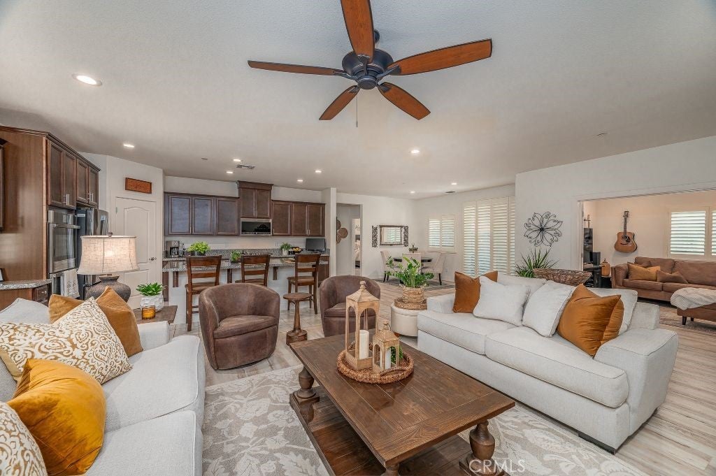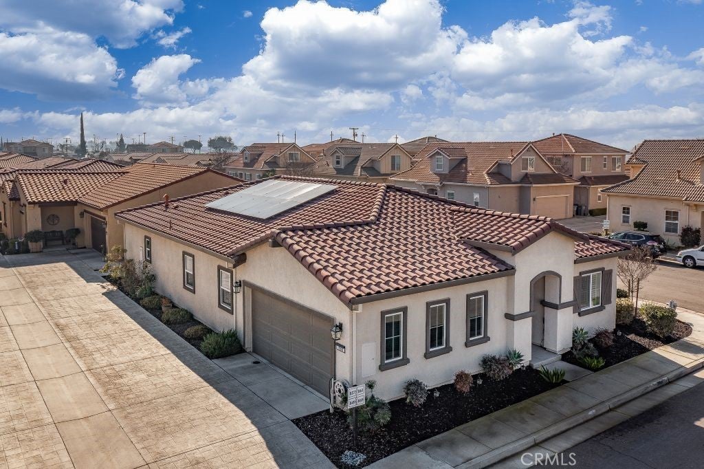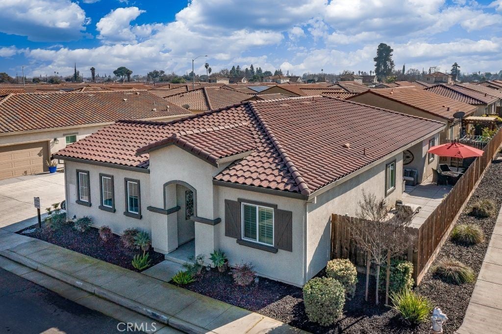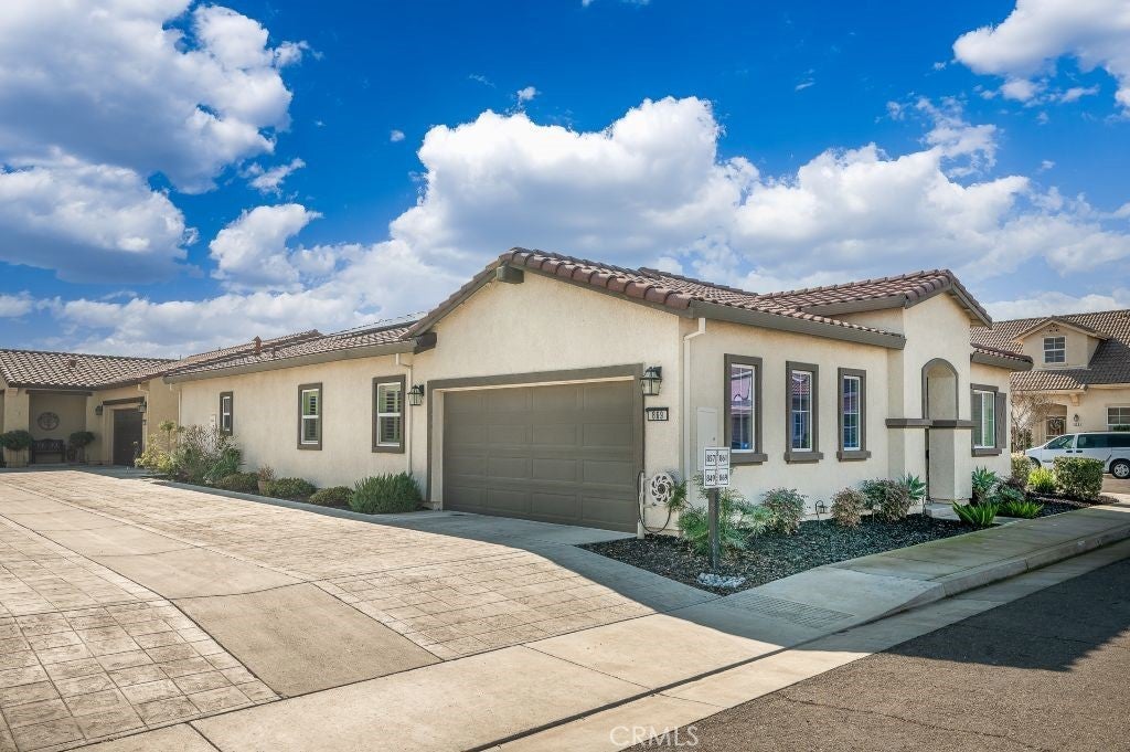 Welcome to 869 Grace Drive, a beautifully updated home in Los Banos' premier 55+ gated community. Designed for comfort and ease, this move-in ready residence offers a bright, open floor plan filled with natural light and modern upgrades throughout. Enjoy a premium corner lot with no direct neighbors and a chef's kitchen featuring GE Profile appliances, double ovens, a large island with a sink, and a new GE cabinet-depth refrigerator. The home showcases premium LVP flooring, wood shutters, fresh paint, and stylish lighting and ceiling fans in every room. Step outside to a freshly landscaped backyard and side yard with a retractable awning, patio seating area, and timed exterior lighting perfect for relaxing evenings. Additional highlights include solar power for energy efficiency. Residents enjoy a vibrant, amenity-rich lifestyle with a clubhouse, gym, pool, tennis courts, RV/boat parking for added flexibility and a variety of group activities. Experience relaxed, modern living at 869 Grace Drive!