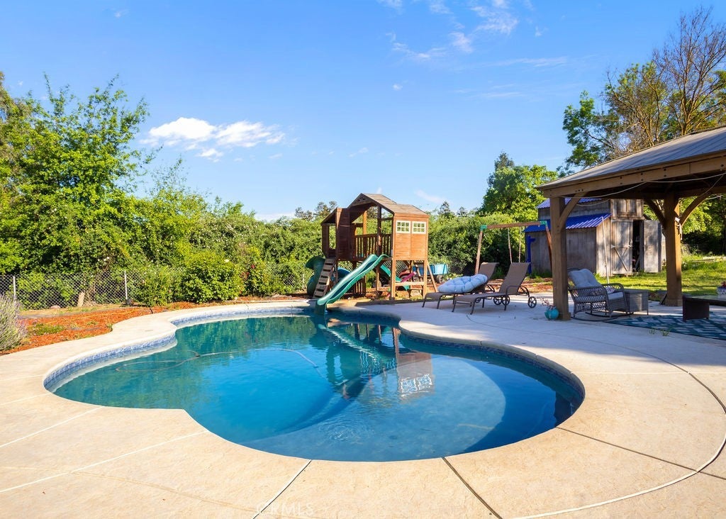 Welcome to 3646 Harbor Dr., a home where you have room to breathe, grow, and host. Situated on a full acre at the end of a quiet cul-de-sac, this 4-bedroom, 2.5-bath residence offers 2,779 sq ft of thoughtfully designed space with the kind of privacy and room that's hard to come by. The expansive lot includes dedicated RV and boat parking, open space for kids and pets, and the serene backdrop of a creek just behind the property. Step inside to a stunning blue kitchen with ample cabinetry and a breakfast bar, flowing into a formal dining room adorned with an elegant chandelier, perfect for entertaining. A dedicated reception space with its own statement chandelier adds warmth and character, and the wood-burning fireplace makes the living room the coziest spot in the house. Upstairs, the primary suite offers a private balcony with peaceful views of the backyard and pool. A bonus room rounds out the upper level, ideal for a home office or content creation space. Back downstairs, a playroom adds flexibility for the whole family. Outside, a brand new pool, a charming gazebo, and a chicken coop make the backyard a true gathering place. Whether you're hosting or just unwinding, the full acre delivers. Solar paid off at closing means little to no electric bill, and well water means no water bill either. No HOA. Just minutes from UC Merced, in a safe, quiet, and highly desirable neighborhood. This is more than just a home; it's a place to settle in, spread out, and truly enjoy where you live.