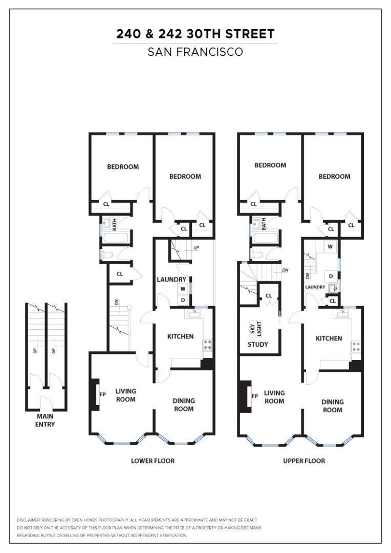 Charming San Francisco Duplex located in desirable Noe Valley. This fantastic 3000+/- sq ft property boasts all the charm of old San Francisco with a large private backyard and lovely rose garden. Head upstairs to one of the almost identical units where you are greeted with hardwood floors throughout. The light-filled living room, complete with cozy fireplace flows into the spacious dining room perfect for entertaining. From there head into the kitchen where you will find plentiful cabinet space and into the laundry room with access to the backstairs that leads down to a large 2-car garage with lots of space for a workshop or studio. Each unit has 2 bedrooms with views of the backyard along with a split full bath. One unit has an additional den/study perfect for all your lifestyle needs. Excellent proximity to parks, restaurants & shopping, with easy access to public transit and Hwy 280 for all of your bay area commutes.