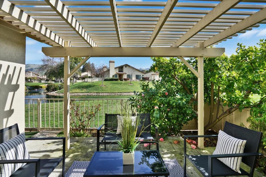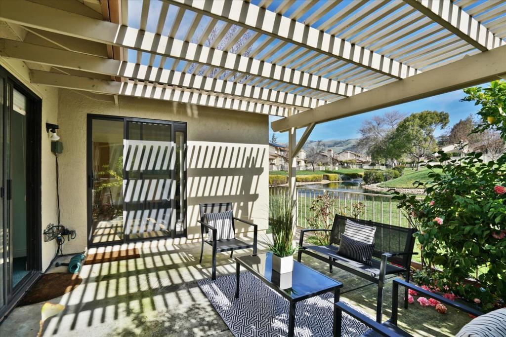 NEW MASSIVE PRICE REDUCTION! Welcome to Resort-Style living for active 55+ Gated Golf retirement community at The Villages. SINGLE LEVEL! END UNIT , BACKYARD POND VIEWS Home! In the Village Del Lago neighborhood. Enjoy a tranquil setting with a manicured emerald green landscape throughout the community. Soaring high ceiling in dining room & kitchen dining area with bright skylights. Quartz countertops, electric stove, laminate kitchen flooring, breakfast bar, cushioned carpet throughout the home, double door main bedroom,ceiling fan, private main bedroom cozy patio, large soaking tub with dual sink. Central heater & air conditioner. Enjoy serene relaxing backyard patio pond views in the morning with polished lush green plants that provide both shade & privacy including a rustic overhang. Direct access from Garage to House. Comfortably can accommodate 2 Cars with easy accessible additional guest parking just steps away & main clubhouse is also just a couple minutes walking distance from the home. Enjoy the exceptional amenities which include 24-hour security gate, golf courses, social clubs, pickleball, tennis, bocce, swimming pools & much more! Resort living in the heart of Silicon Valley for active adults. Future buyers to verify any additions/permits with City of San Jose.
