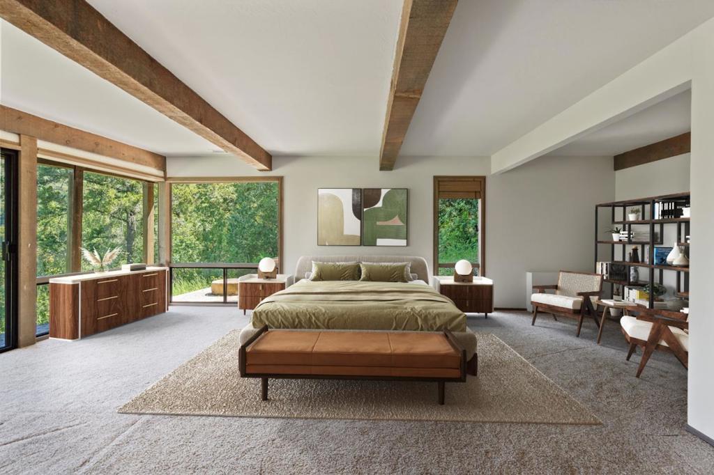 Nestled at the end of a private drive, this 3,320 square foot sits on almost 1.5 acres (per county) in tranquil Los Trancos Woods. Floor-to-ceiling and clerestory windows as well as skylights and sliding doors fill the 2-story home with natural light and provide views to the surrounding natural environment from every room. The top level includes an open-concept layout creating a seamless flow between the living room, dining area and kitchen. The expansive living room includes a wood burning fireplace surrounded by a sunken, built-in circular sofa, a wet bar and an additional large area ideal for a game table. The dining area flows seamlessly to the large kitchen, complete with island and walk in pantry. Access to the connecting deck from all three areas creates a large space ideal for indoor/outdoor entertaining. Completing the level is a spacious bedroom, a full bath. The lower level accommodates the primary suite and the third spacious bedroom, both with en suite baths, walk-in closets and outside access. The conveniently placed large laundry room includes ample cabinetry, a sink and an attached large storage room.
