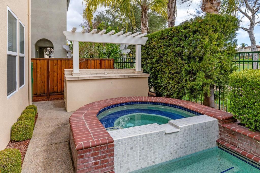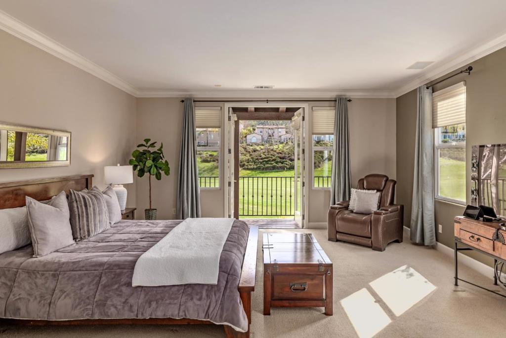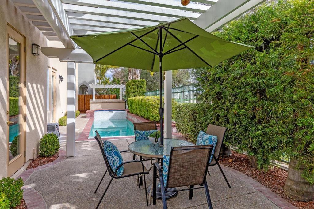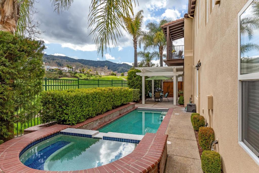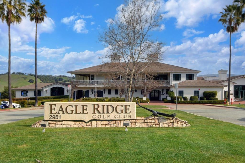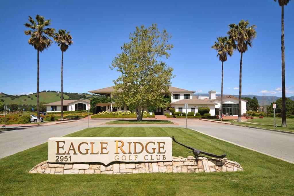 This lovely Birkdale model is located in the gated community of Eagle Ridge Golf Club. Positioned on the 11th fairway with Uvas Creek in front of the home. The office includes built-in cabinetry and wood floors. Large formal dining room. The kitchen offers tile counters along the perimeter with a granite counter and a sink in the island with a breakfast bar. The kitchen opens to the family room with a fireplace and built-in entertainment center. The center courtyard is encircled by French doors from the office, dining room and family room. A separate 1-car garage is included as well. There is a laundry room, full bathroom and a bedroom with wood floors and a walk-in closet on the first floor. The primary bedroom features French doors to the balcony for beautiful golf course views. The primary bath includes a large tub flanked by 2 vanities, stall shower and 2 walk-in closets. The front bedroom has views of the wooded area along Uvas Creek from the balcony. There is a full bath in the hallway with light up mirrors over each sink and custom tile in the shower. The third bedroom features golf course views. You will also find an alarm system, crown molding and built-in speakers. Beautiful lap pool with a waterfall and spa plus a pergola just outside the kitchen door.