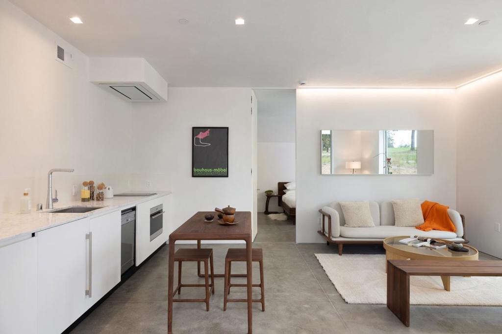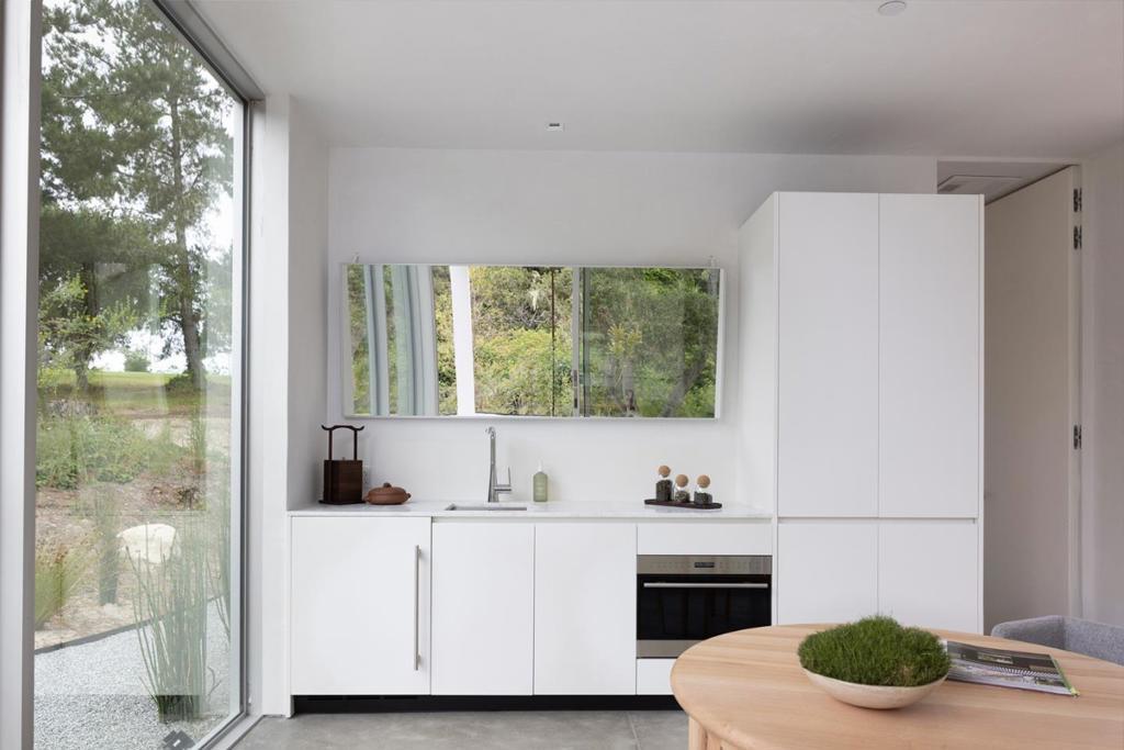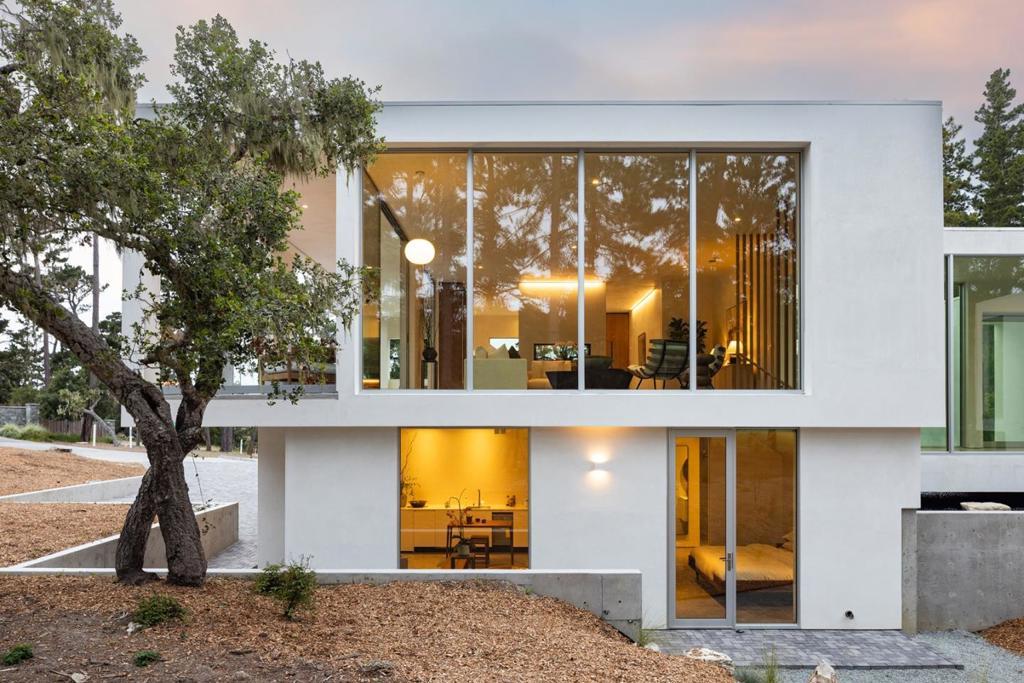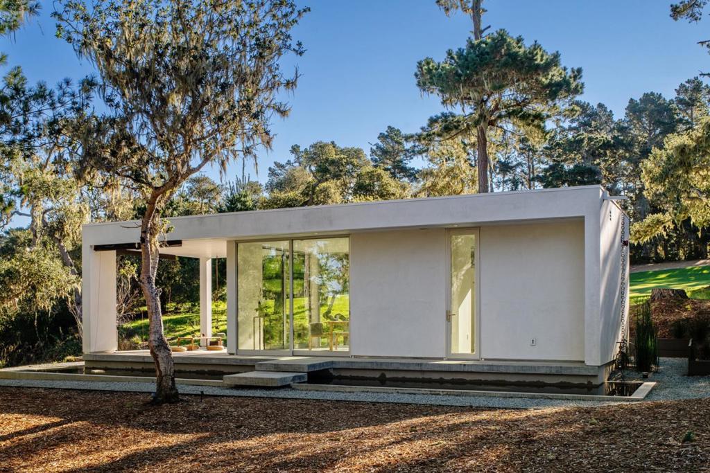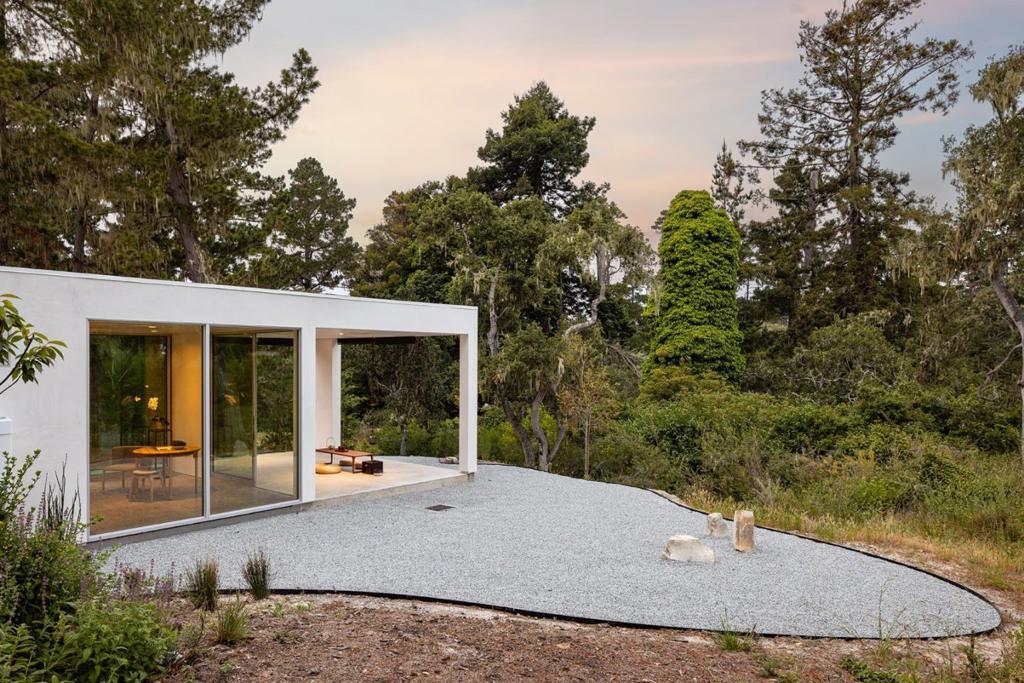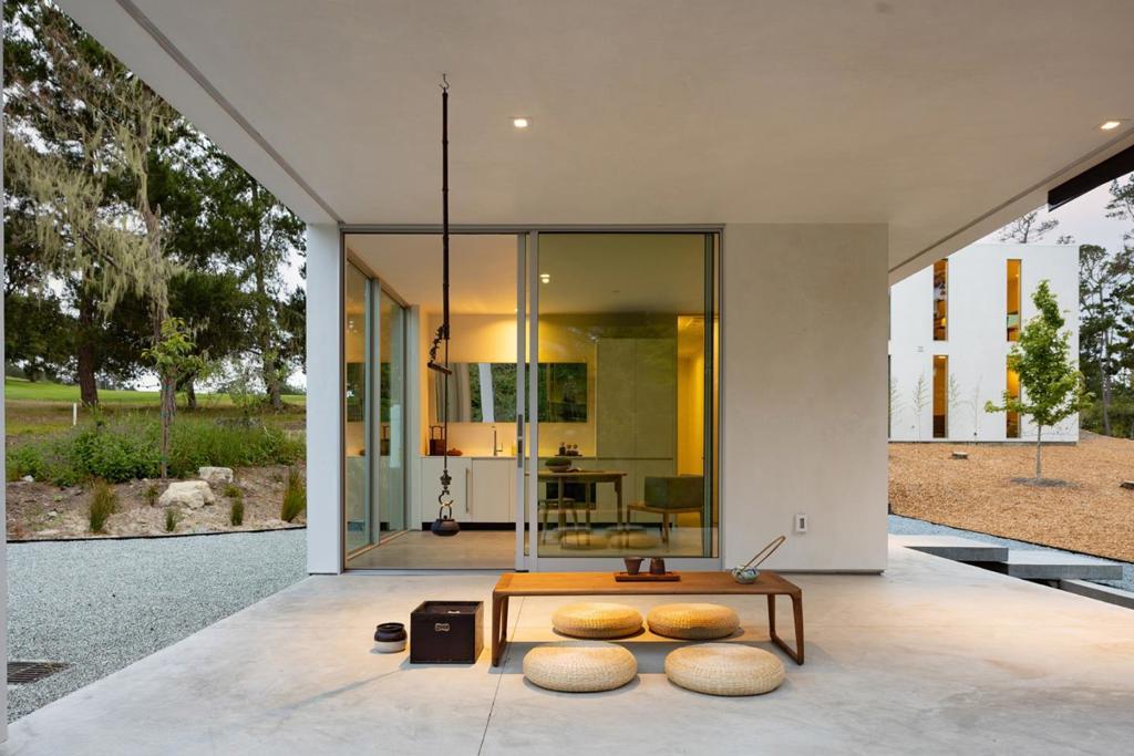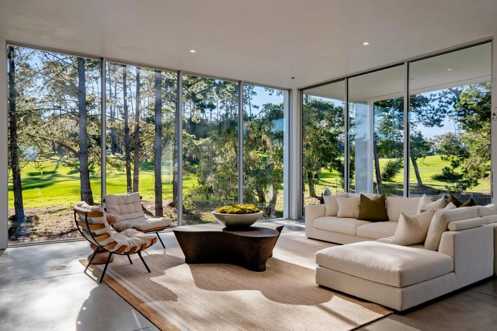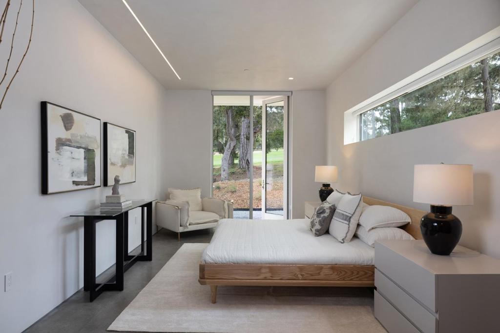 With sweeping views of Spyglass Hills 11th fairway and filtered ocean vistas, the Waterbridge House is an extraordinary Scandinavian-Japanese minimalist estate. This newly constructed compound is comprised of the stunning main house, a private ADU, and a Tea House (Guest House) floating on water. The striking architecture embraces intentional simplicity, blending natural elements with modern form. Two architectural axes, interior and exterior, guide you through spaces that reveal and conceal, including the "Waterbridge," a glazed walkway over a tranquil pond. The sculptural Cloud Steps lead to a light-filled interior where polished concrete floors, Western floor-to-ceiling windows, Italian concealed Infinity doors, and Poliform cabinetry define quiet luxury. Sustainability meets sophistication with triple-glazed windows, radiant heat, and an automated energy recovery system. From Sub-Zero, Wolf, and Miele appliances to Italian Flos lighting and Simply White plaster walls, every detail reflects enduring craftsmanship and environmental mindfulness. Located in the heart of Pebble Beach near The Lodge and by the Spyglass Club House, Waterbridge House is a half mile to the beach and a short drive from all the wonderful amenities of Carmel, Big Sur, and the Monterey Peninsula.