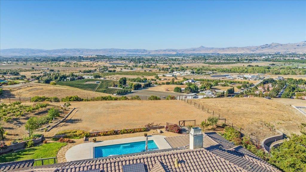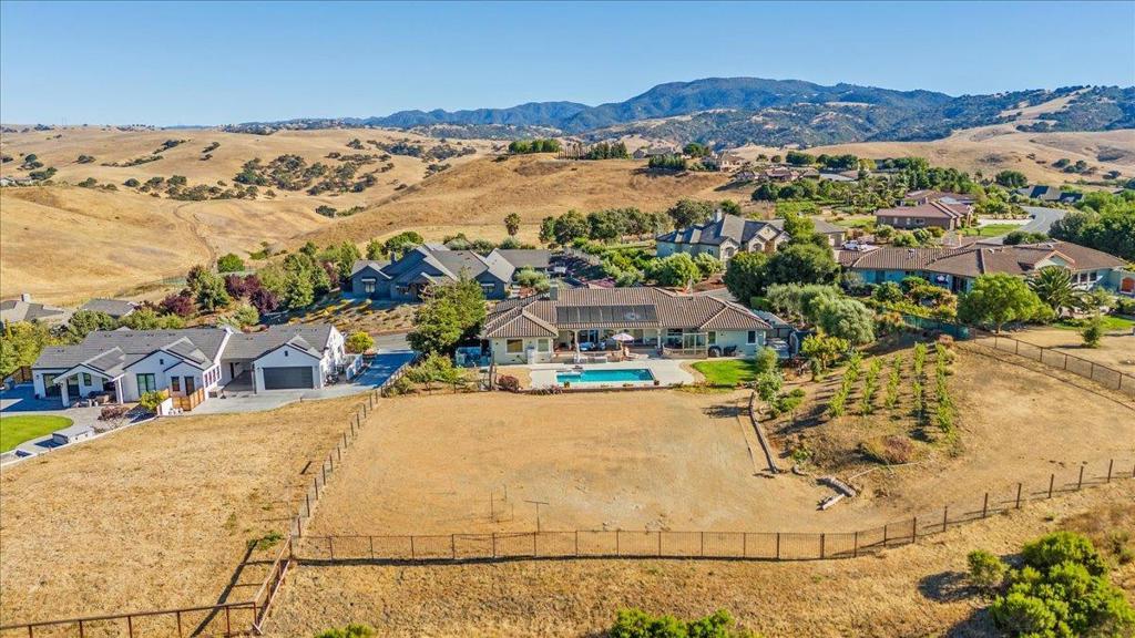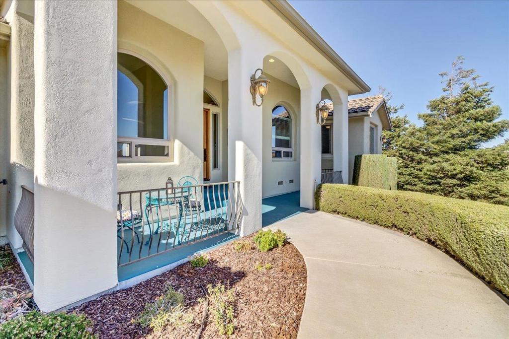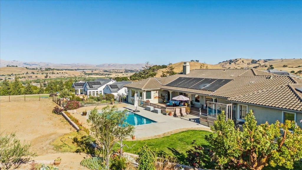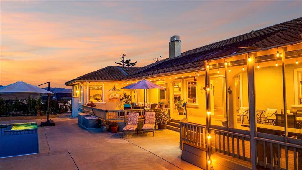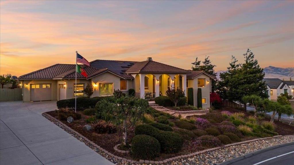Well-Appointed Home in Gated Foothill Community with Panoramic Views Over 4,000 Sq Ft + 700 Sq Ft Finished Bonus Room | 1 Acre | 4 Beds 3.5 baths+ Office + Bonus | Gated Community Enter through a barrel-ceiling foyer into this stylish custom home with 4 beds, 3.5 baths, office, and large bonus room with private entrance. Formal living/dining rooms feature crown molding and rich finishes. The open family room offers built-ins, surround sound, custom gas fireplace,and flows into a chefs kitchen with granite island and countertops, custom cabinetry, double ovens, 5-burner range, dual drawer dishwashers, walk-in pantry with wire shelving and separate butler's pantry with barrel ceiling. Travertine and hardwood floors, high ceilings, dual-zone HVAC, solar panels, and solid 8-ft doors throughout. Expansive laundry/utility room with granite counters, deep sink and desk. Primary suite has spa-like bath, jetted tub, triple-head shower, and deck access. Private guest/in-law suite has separate entrances, sitting area, and full bath. Jack & Jill bedrooms share full bath. Enjoy city light views from a spacious deck and patio with solar-heated pool, spa, vineyard, fruit trees, shed, 3-car garage, and additional standing room subarea storage. HOA includes a community clubhouse and park.