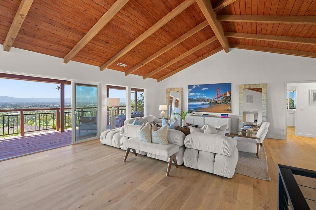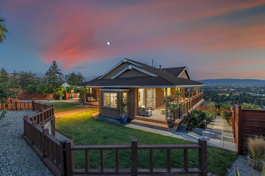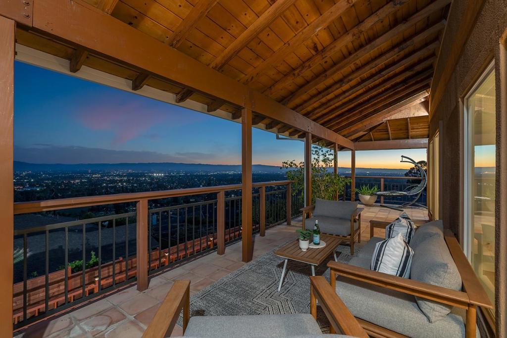 Exquisitely remodeled home with sweeping city light & mountain views above San Jose Golf Course, offering premier golfing and dining nearby. Open floor plan with vaulted ceilings, hardwood floors & expansive glass walls. Gourmet kitchen with Thermador appliances, quartz counters & waterfall island. Primary suite with vaulted ceilings, window seat & French doors to covered porch. Downstairs: family room, 2 bedrooms, luxe bath & patio access. Central AC, 2-car garage, lush landscaping, multiple outdoor entertaining areas & 2 covered porches. Close to Alum Rock Parks 720 acres of hiking, horseback riding, bicycling & picnic areas.