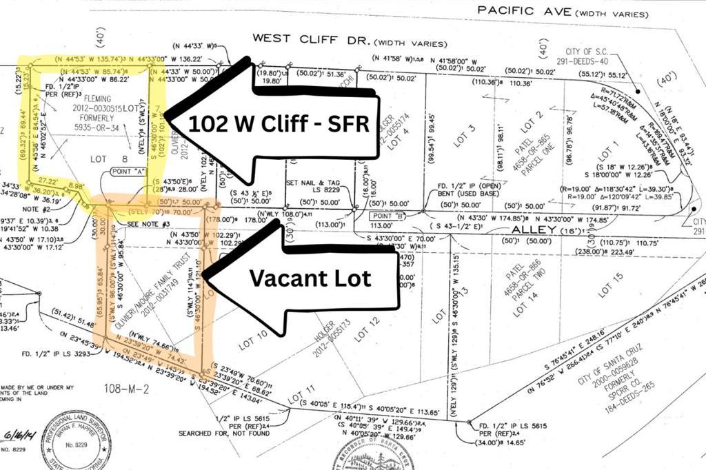 Special opportunity to own a piece of Santa Cruz history and a large piece of land near the beach. This offering includes a single family home plus an adjacent vacant lot, together totaling over 15,000 SF. The home is single level with an ocean peek from the front porch and sits in a unique, private location at the end of Viaduct Ct off West Cliff Drive, directly across from Beach Hill and near the Wharf, Boardwalk, and West Cliff Drive. The property also has views of the Santa Cruz mountains, Depot Park and city. Could be a great property for those that need extra space for vehicles, boats, storage or create a nice garden area in the vacant lot. Rare chance to purchase two parcels together, with the option to also buy the neighboring duplex at 108/110 W Cliff Drive separately. Buy all 3 for a once-in-a-lifetime opportunity to own your own section of Santa Cruz by the beach with upside potential.