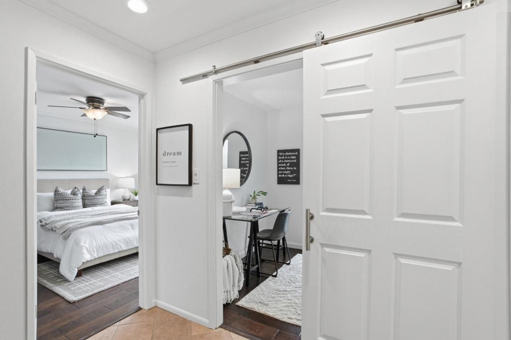 Perched on the top floor of the Lauriedale Community, 4117 George Ave #4 feels like a private retreat above the trees. Sunlight pours through tall windows, illuminating vaulted ceilings and a welcoming living room with beautiful engineering flooring, recessed lighting, a cozy electric fireplace, and plantation shutters that open to a peaceful balcony surrounded by greenery. The dining area blends charm and function with built-in shelving, while the galley kitchen shines with Quartz countertops, tile backsplash, stainless-steel appliances, pantry and pendant lighting over a convenient pass-through bar perfect for easy entertaining. A tiled hallway leads to the private wing, where the primary bedroom offers engineered hardwood floors, large windows, and a modern frosted-glass closet. A sliding barn door reveals the office/nursery ideal for remote work or quiet creativity. The updated split-bath features a tiled shower-over-tub, linen closet and stylish contemporary vanity. With pool and tennis, gym and clubhouse amenities, lush landscaping, and proximity to Hillsdale Mall, Caltrain, and major highways, this bright top-floor unit is a tranquil escape at the heart of San Mateo. ***SELLER WILL PROVIDE BUYER A PROFESSIONAL LAUNDRY SERVICE FOR 2 YEARS, DOOR TO DOOR THROUGH MULBERRY'S.