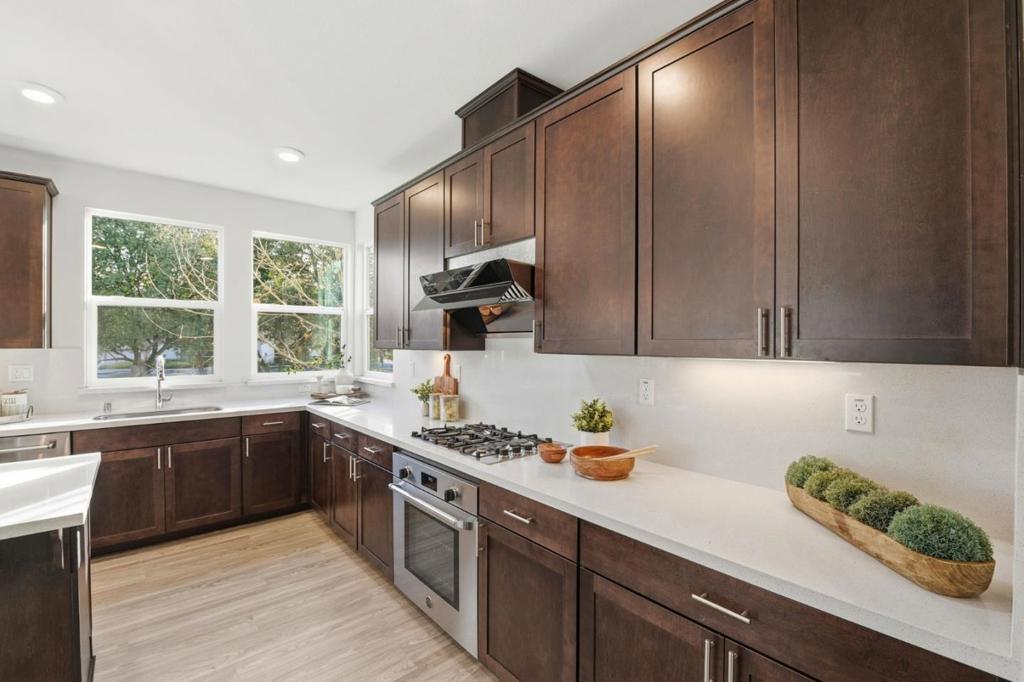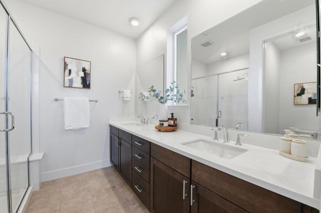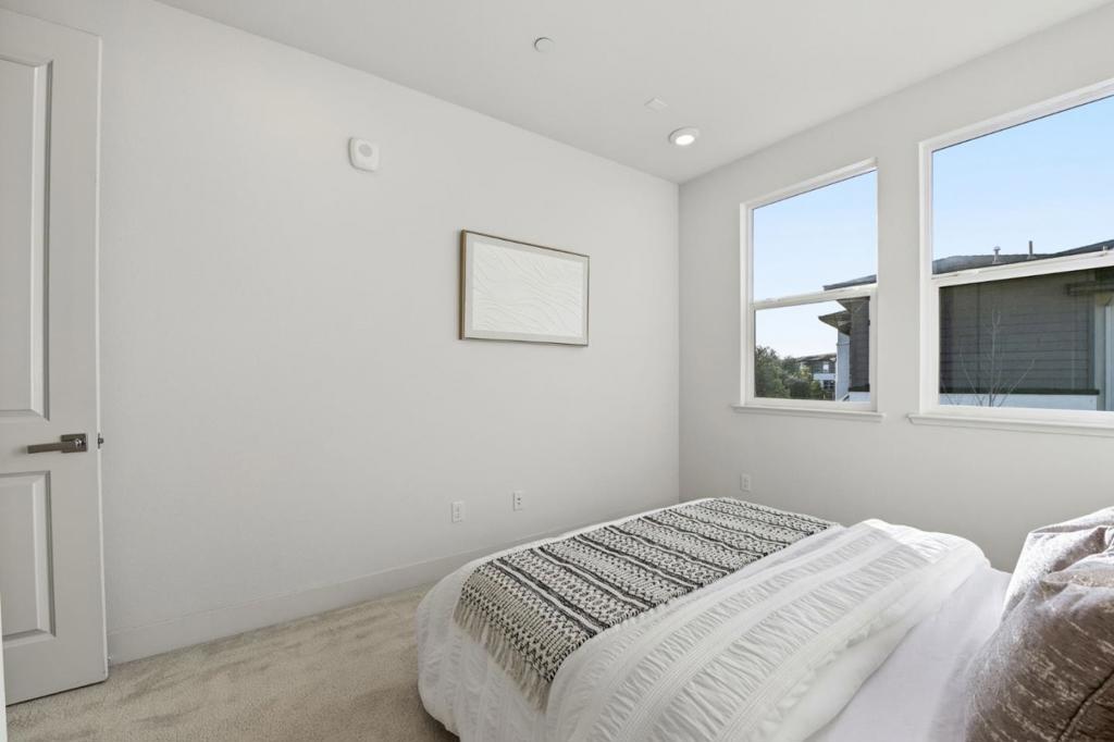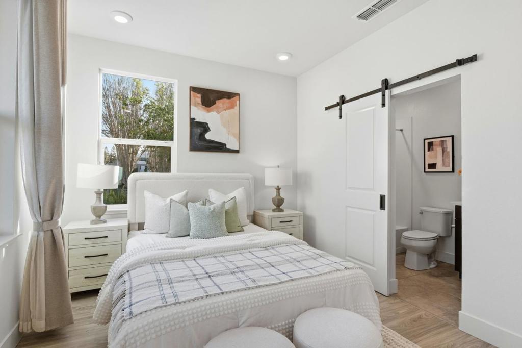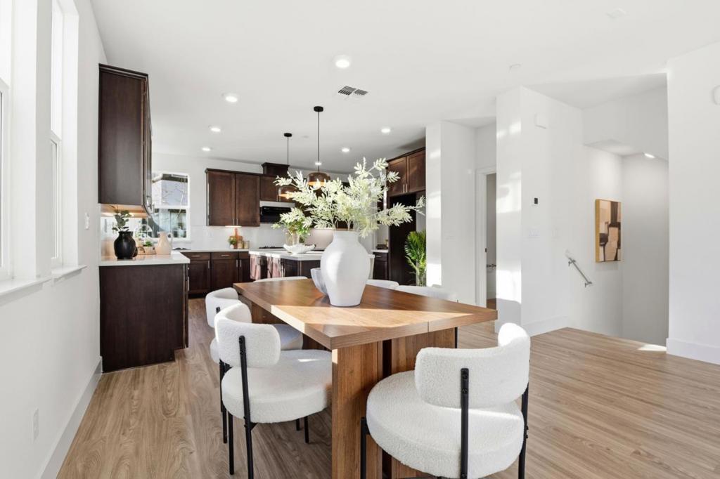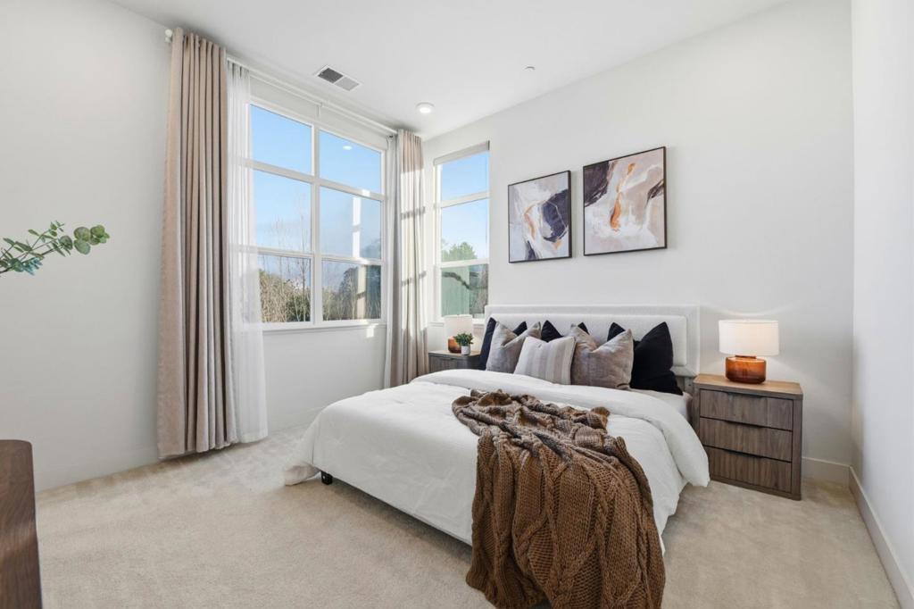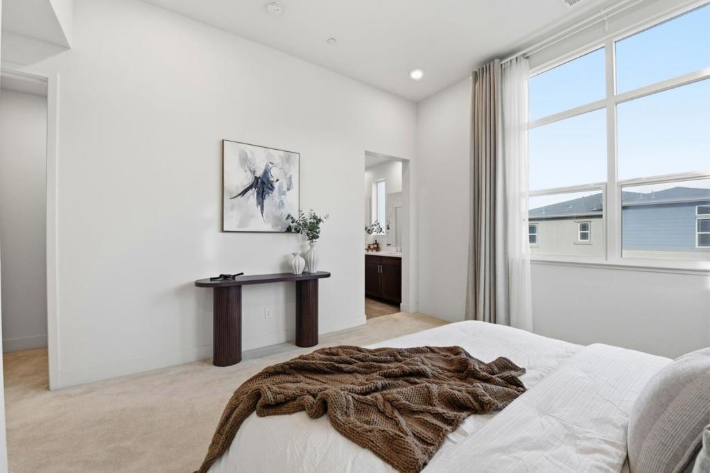 Luxurious East-Facing End-Unit Townhome in the Desirable Nexus at The Vale Welcome to this beautifully maintained, light-filled end-unit townhome in the highly sought-after Nexus community at The Vale. Offering four bedrooms and three-and-a-half baths, the home features a flexible layout designed for comfortable, modern living. The entry level includes a private junior suite, ideal for guests, extended family, or a home office. The main living level is thoughtfully designed with an open-concept kitchen, dining, and living area that flows seamlessly for everyday living and entertaining. Elegant plank flooring runs throughout, and the great room opens to a spacious private balcony for effortless indoor-outdoor living. The kitchen features white quartz countertops, a large center island, stainless steel appliances, and ample cabinetry. Upstairs, the oversized owners suite offers soaring ceilings, a walk-in closet, dual vanities, and a large walk-in shower. Two additional bedrooms share a well-appointed hallway bath. Ideally located minutes from major tech campuses, commuter shuttle stops, parks, shopping, and downtown Sunnyvale. Community amenities include a clubhouse and playground.