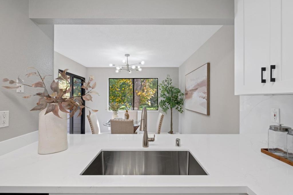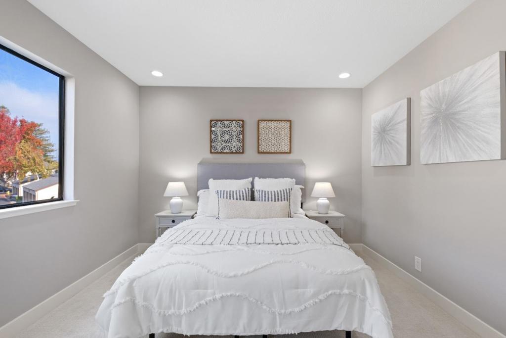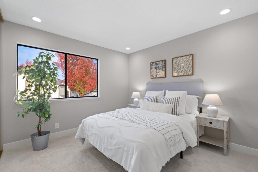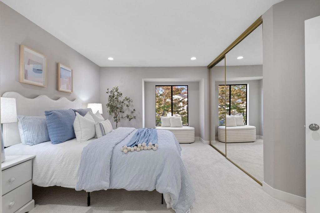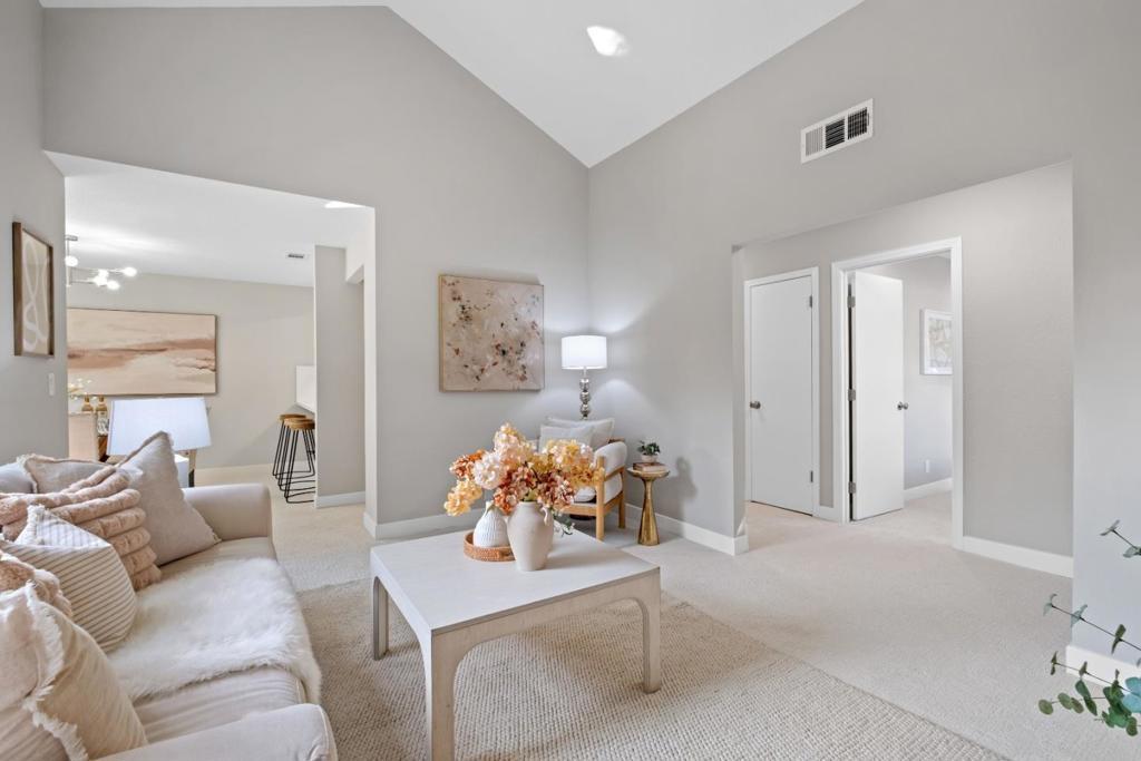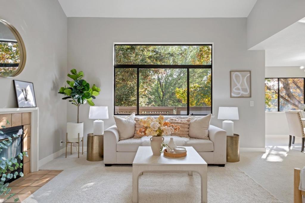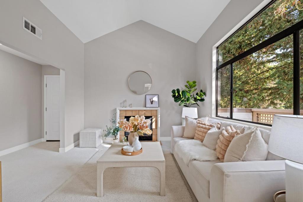 *Bask in soaring ceilings and serene park views in this beautifully renovated condo, offering modern comfort and exceptional privacy with no upstairs neighbors. *The airy living room features a dramatic high ceiling and cozy fireplace, seamlessly flowing into the dining area and out to a lovely private patio overlooking the lush greenery of Townsend Park, perfect for morning coffee or evening relaxation. The newly remodeled kitchen features quartz countertops, stainless steel appliances, and ample cabinetry. Three well-sized bedrooms include a spacious primary suite with an ensuite bath, plus convenient in-house laundry. Parking includes one attached garage and one assigned outdoor space (HOA permit included). *Located just steps from Townsend Park and the San Jose Golf & Tennis Course, and within walking distance to H-Mart, 99 Ranch, and Costco, this home combines tranquility with unbeatable accessibility to top tech employers like Nvidia, Google, Apple, and Supermicro.