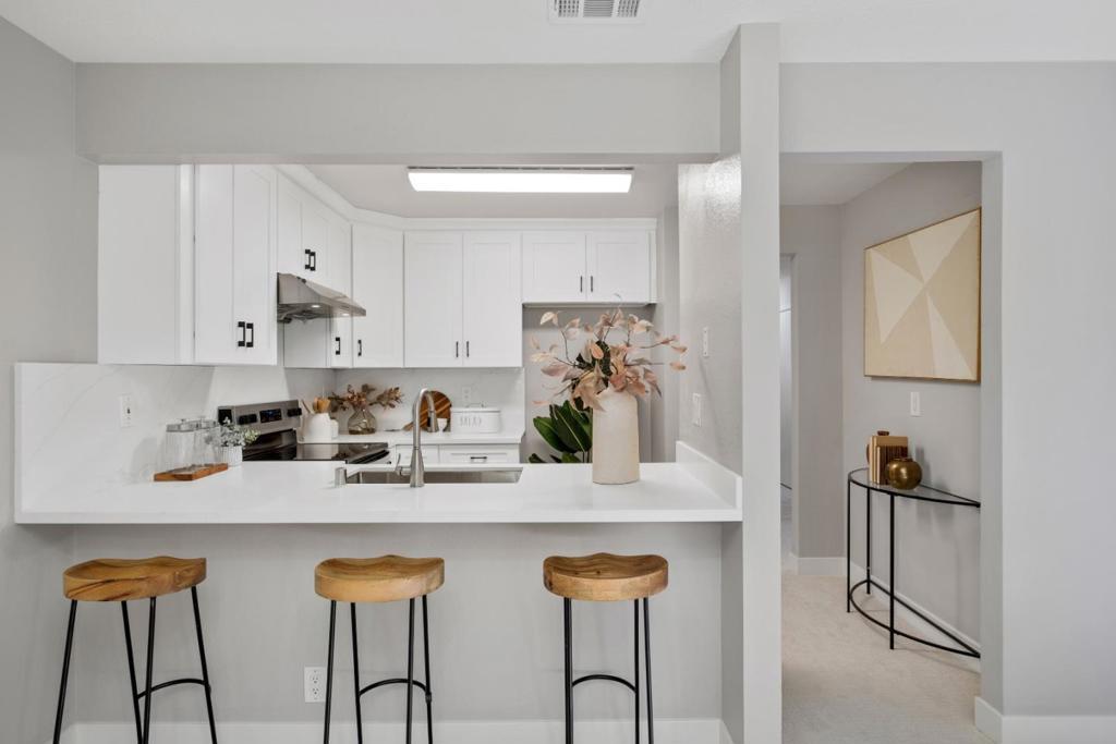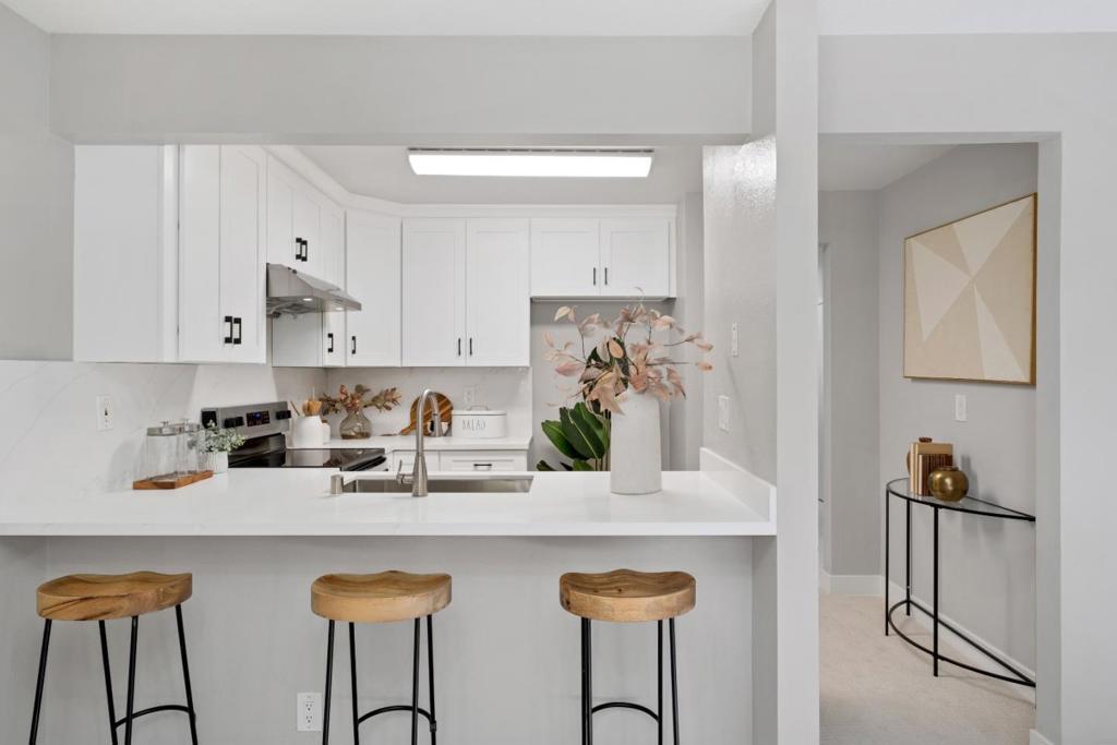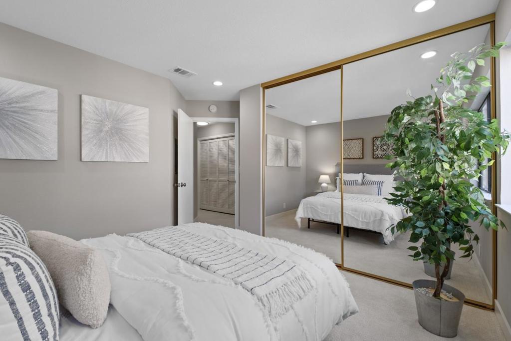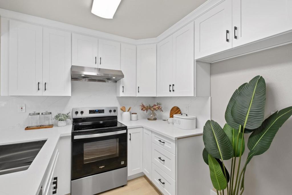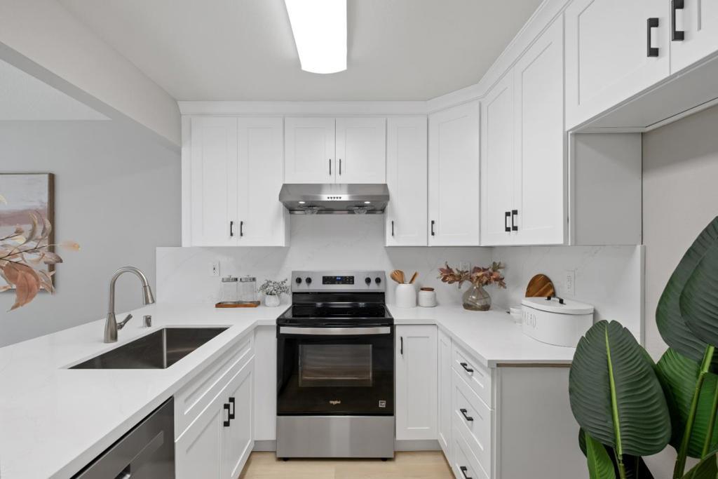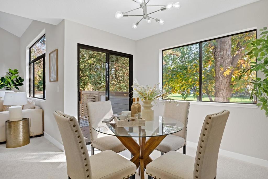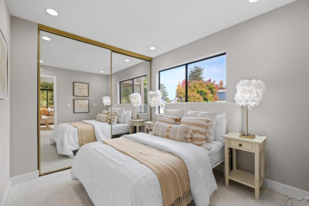 *Bask in soaring ceilings and serene park views in this beautifully renovated condo, offering modern comfort and exceptional privacy with no upstairs neighbors. *The airy living room features a dramatic high ceiling and cozy fireplace, seamlessly flowing into the dining area and out to a lovely private patio overlooking the lush greenery of Townsend Park, perfect for morning coffee or evening relaxation. The newly remodeled kitchen features quartz countertops, stainless steel appliances, and ample cabinetry. Three well-sized bedrooms include a spacious primary suite with an ensuite bath, plus convenient in-house laundry. Parking includes one attached garage and one assigned outdoor space (HOA permit included). *Located just steps from Townsend Park and the San Jose Golf & Tennis Course, and within walking distance to H-Mart, 99 Ranch, and Costco, this home combines tranquility with unbeatable accessibility to top tech employers like Nvidia, Google, Apple, and Supermicro.