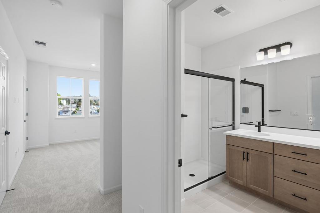 Unique opportunity to buy new in Castro Valley. Located in a top-rated school district, the open floor plan boasts a spacious dining and living area featuring sliding glass doors with access to your own private deck. The modern kitchen showcases granite countertops with backsplash, a pantry and stainless-steel appliances. Convenient bedroom and full bath on the same floor. Located on the 3rd floor, the large primary bedroom leads to a walk-in closet. Relax in a spa-like primary bath showcasing dual vanity sinks. Other features include luxury vinyl plank flooring, a 50-amp. electric charging station pre-wiring, solar energy system (lease or purchase required) and a limited 10-year warranty. This brand-new community will feature a community play area, bike lane, bike racks and bike repair station, plus park-like areas with seating, open space and art installations. Walking distance to Castro Valley BART station; convenient to I-580 and Tri Valley, San Jose and Mid-Peninsula job centers. Close to outdoor recreation, including Chabot Regional Park and Cull Canyon Regional Recreation Area. Schedule an appointment today.