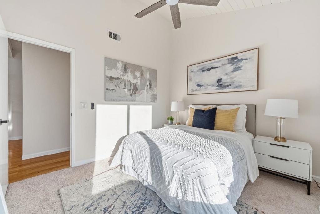 Light-filled end-unit townhouse in the highly desirable and tranquil Sycamore Hill community a must-see! Fresh paint, new carpet, hardwood flooring, and expansive windows bring a bright and beautifully refreshed feel to this charming 3-bedroom, 2.5-bath home. Step inside, where the soaring ceiling and natural light from the skylight invite you into the living room. The vaulted ceiling gives the living room an airy, relaxed feel that flows right out to the private patio. Enjoy watching the kids play while doing dishes, or unwind at the built-in study desk. A second patio just off the open kitchen/dining area adds more outdoor space to relax or entertain. A formal dining/flex area and a convenient half bath complete the lower level. Upstairs, the spacious primary bedroom offers vaulted ceilings and an ensuite bath. Another bedroom features a unique loft space with a charming ladder. An additional bedroom and a full hall bath round out the upper level. Community amenities include miles of scenic walking and biking paths, tennis courts, pickleball, playgrounds, and clubhouses with pools. Minutes from downtown Danville, shopping, dining, parks, freeway access, and excellent schoolseasy living in an unbeatable location.