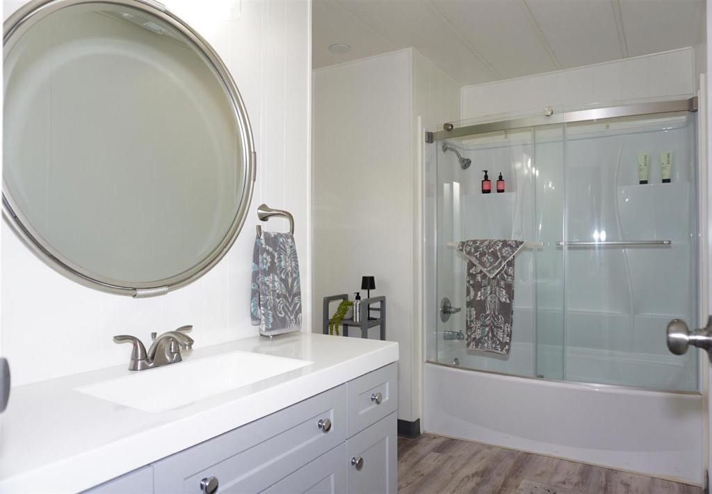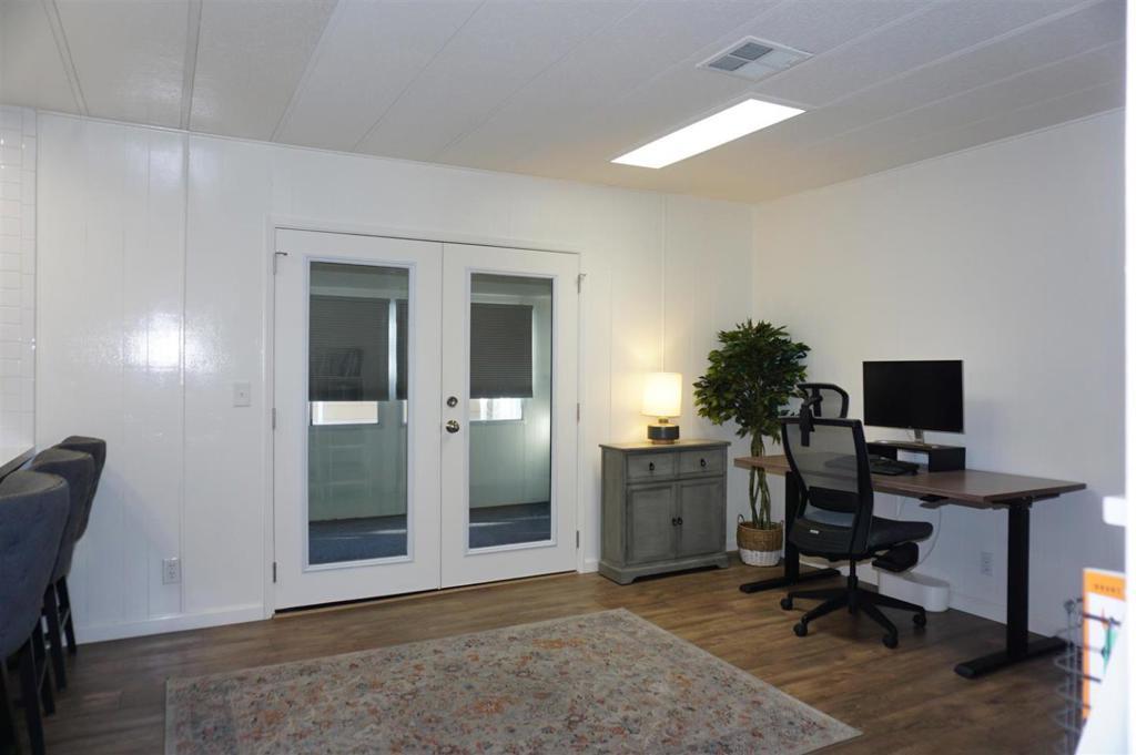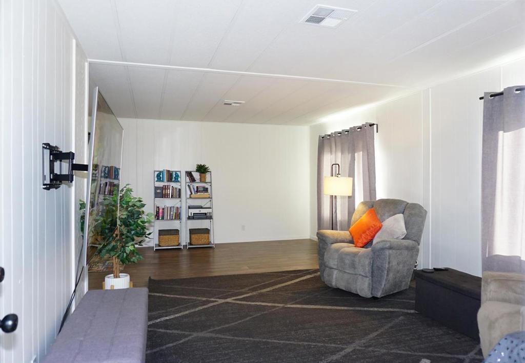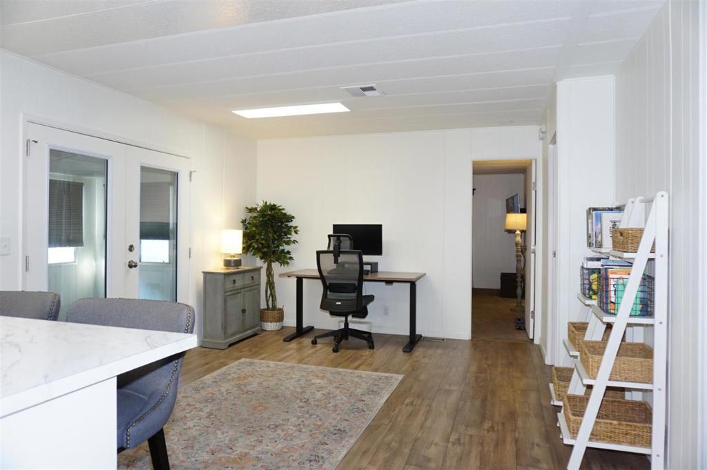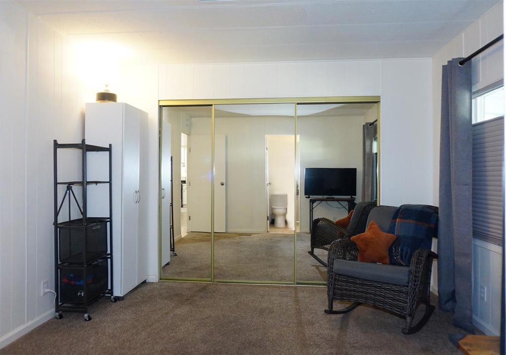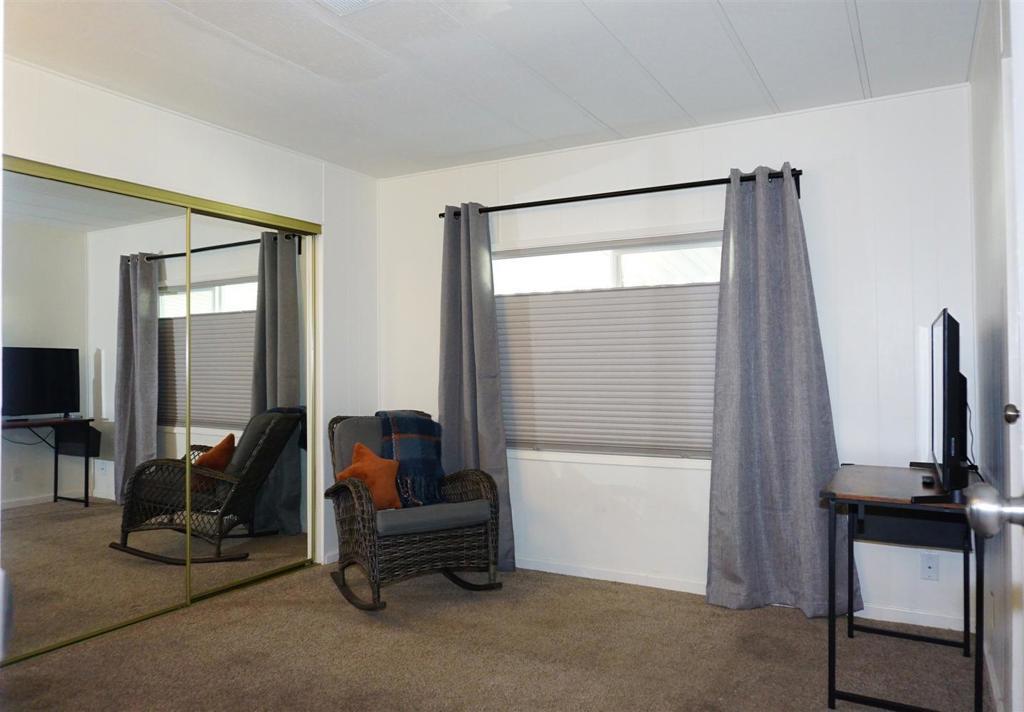 Welcome to this charming home, offering a generous 1,368 square feet of living space. This residence was modernized in 2022 with new lighting throughout, custom end to end closet systems and black out blinds in the 2 spacious bedrooms. The kitchen is seamlessly integrated with the family room, creating a functional and inviting space for both cooking and gathering. Enjoy your meals at the breakfast bar or the dining area within the living room, offering flexibility for casual or more formal dining experiences. The light bright kitchen features lots of storage, lots of counter space, full subway tile backsplashes, large stainless steel sink with water filter, & stainless steel appliances. The home boasts a mix of laminate flooring and carpet in bedrooms, adding comfort & style throughout. This home is equipped with gas heating & double pane windows for energy efficiency. Laundry room features storage cabinet & stackable Electrolux washer & dryer, making laundry a breeze. Attached 8x26 (208sqft) enclosed patio with French door entrance from the house and 2 other entrances to the exterior of home. 2022 Exterior upgrades include fresh paint and double pain windows. Close to the entrance this low maintenance yard includes pavers & trees surrounding the home. Bendix 1975 S/N S4286X/U