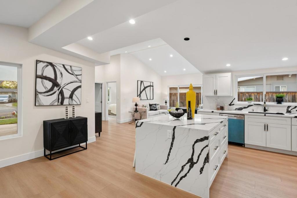 Stunning, fully rebuilt and expanded home in Sunnyvale's highly sought-after Lakewood neighborhood. This residence has been thoughtfully extended by approximately 575 sq ft and completely gutted to the studs, offering a true like-new living experience. Featuring brand-new flooring, roof, double-pane windows, electrical, plumbing, and premium finishes throughout. The gorgeous open-concept floor plan is filled with natural light from oversized windows, creating a bright and inviting living environment. The chef's kitchen is equipped with top-of-the-line appliances, custom cabinetry, and elegant finishes ideal for both everyday living and entertaining. Luxurious bathrooms feature high-end fixtures and imported Italian tilework, providing a spa-like experience. Perfectly located near NVIDIA headquarters and minutes from Apple, Google, Meta, and other major Silicon Valley tech campuses. Enjoy proximity to top schools, parks, shopping, and dining. A rare opportunity to own a completely remodeled, turnkey home in one of Sunnyvale's most desirable neighborhoods.