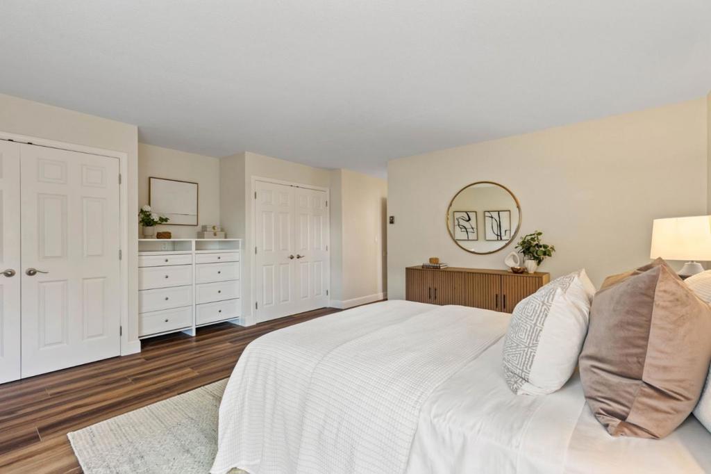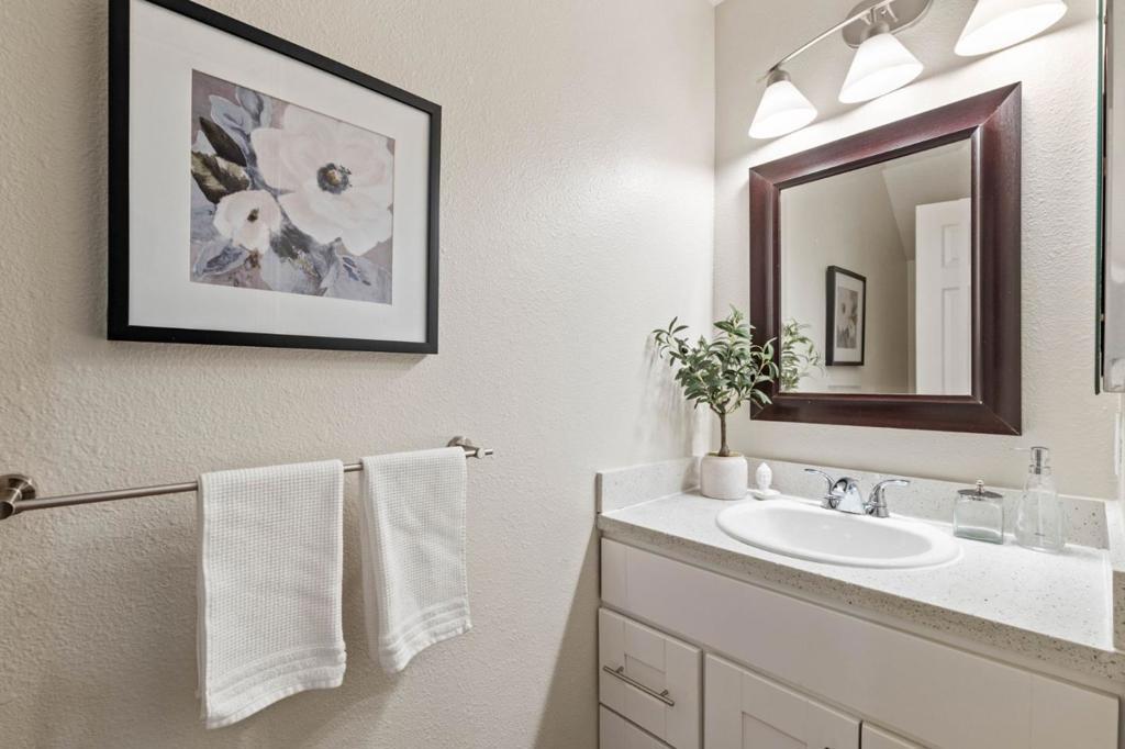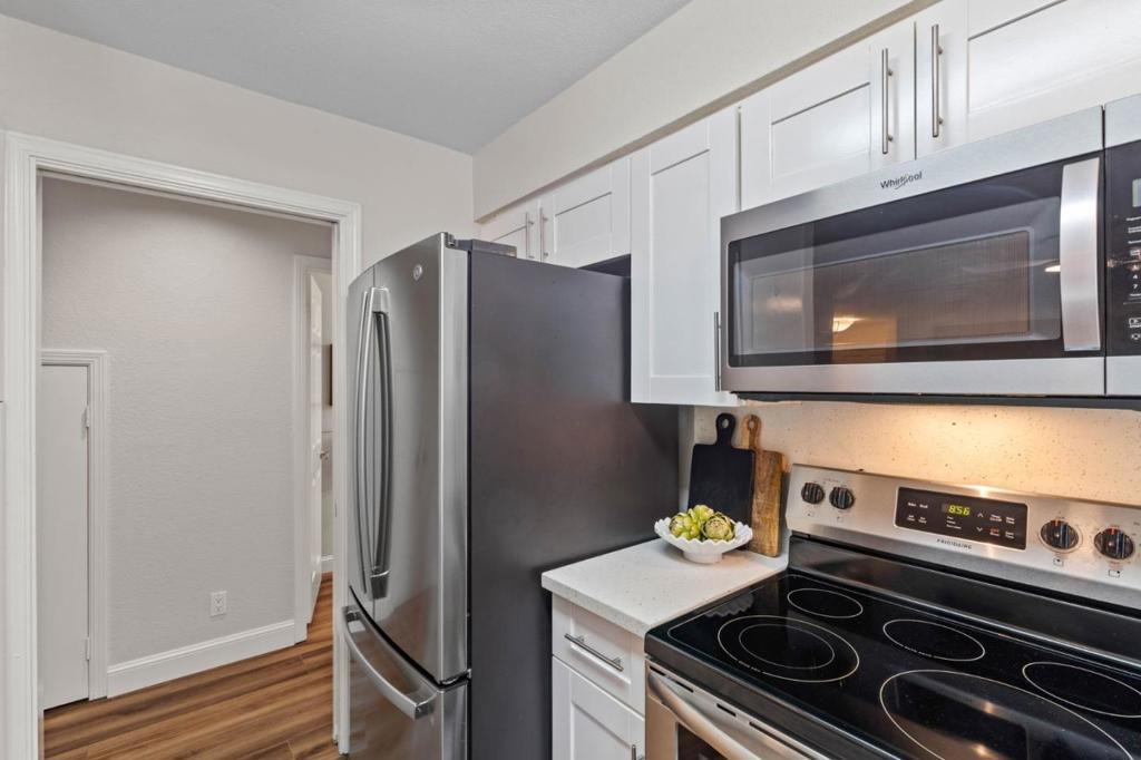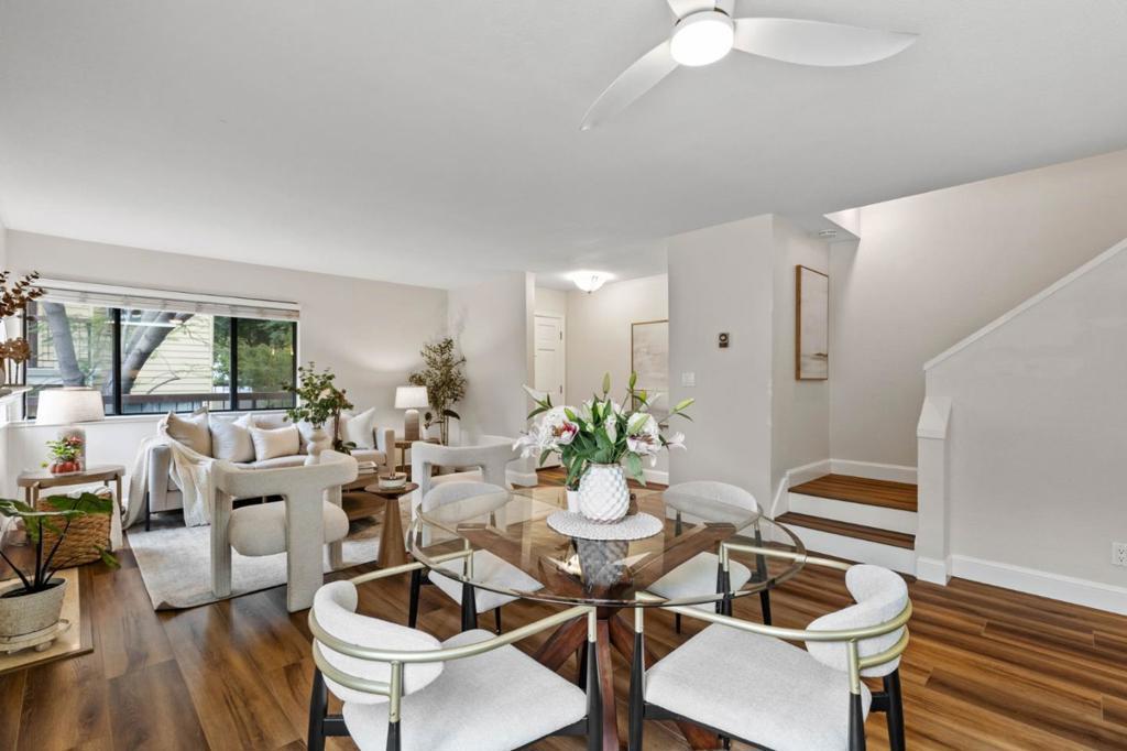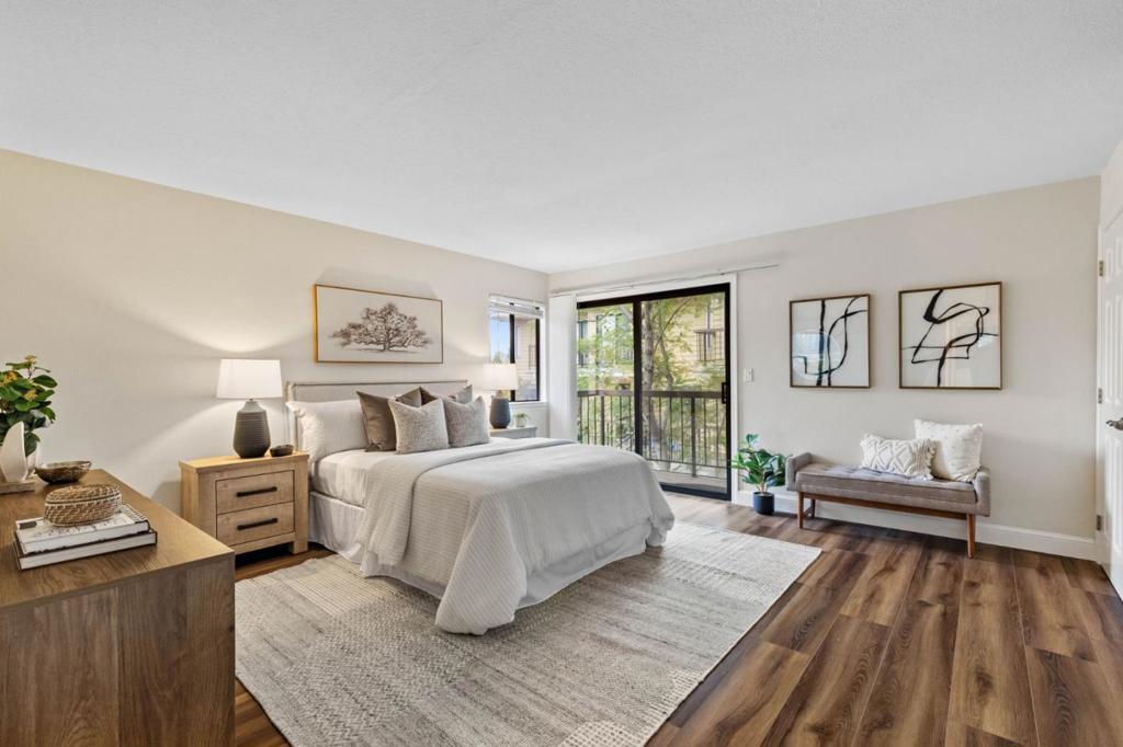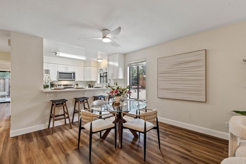 Discover elegance and comfort in this rare private end unit. This fully remodeled gem offers a sophisticated living experience. Sunlight dances through the spacious living areas, accentuating the open concept layout & main level bedroom. The kitchen boasts fresh white cabinetry with a chic stainless steel refrigerator, dishwasher, microwave, & a modern electric range. Quartz countertops & a convenient pantry cabinet complete this gourmet space. The luxury vinyl floors provide an elegant underfoot feel throughout, complemented by fresh paint. Upstairs, generously sized bedrooms feature custom organizers and access to two private balconies, perfect for relaxation. The large patio invites your green thumb forward, while the updated bathrooms and in-unit washer and dryer ensure convenience. Benefit from the security of two dedicated parking spaces in a gated underground area, enhanced by a Ring doorbell and floodlight camera. The community features a pool for leisurely afternoons & HOA dues covering water, garbage, & exterior maintenance. Positioned in a prime location, this home offers a serene escape amidst beautiful shade trees while being in one of Silicon Valley's most connected areas. An exquisite opportunity awaits you. Simply move in and start enjoying your new lifestyle