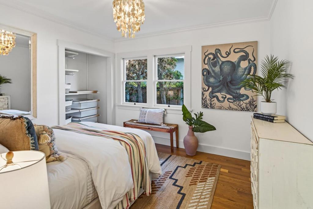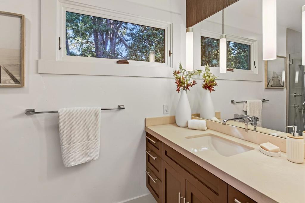 Quintessential Palo Alto bungalow with modern amenities in the coveted Community Center neighborhood. Expanded & extensively remodeled with permits in 2009, this light-filled home features hardwood floors, large windows & flexible floor plan with a spacious fourth room opening to the backyard ideal as a family room or 4th bedroom. The kitchen is anchored by a deep garden window & offers refinished custom cabinetry with soft-close drawers, pantry pullouts, soapstone counters, picket backsplash, Sub-Zero built-in refrigerator, Bosch appliances, induction cooking, Vent-A-Hood exhaust & under-cabinet lighting. The remodeled primary bath includes heated floors, steam shower, floating cabinetry, pendant lighting, wall-mounted toilet & ample storage. The hall bath features heated mosaic porcelain floors, deep soaking tub, subway tile & pedestal vanity. Professionally landscaped front & backyards offer stone pavers, outdoor lighting, gas fire-pit & private entertaining areas. Additional highlights include detached garage, gated driveway with Tesla charger, upgraded electrical & plumbing, keyless entry, tankless water heater, central heat and A/C, Caseta smart switches & new roof (2025). Walk to downtown, library, Community Center, Rinconada Pool, Art Center, zoo, top-rated schools.