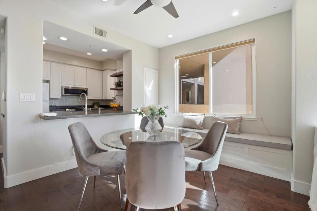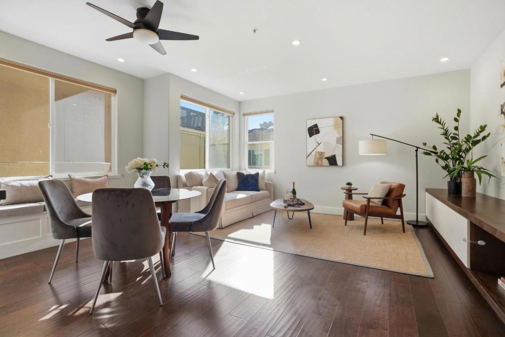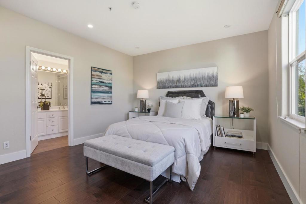 Welcome to this rarely available 2 bedroom, 2 bath end unit condo in one of San Mateos most convenient and vibrant locations. Offering 1,027 sqft of thoughtfully designed living space, this home features an open concept layout, engineered wood flooring, abundant natural light throughout, an updated kitchen with quartz countertops and breakfast bar. Thoughtful custom touches include a media cabinet and a built in storage bench, adding both style and functionality. Additional highlights include in-unit laundry, secure building entry, elevator and 2 assigned parking spaces in a gated garage. Ideally located just steps from Caltrain, Safeway, shopping, restaurants, and nearby parks. Easy access to highways 92, 101, and 280, making commuting effortless