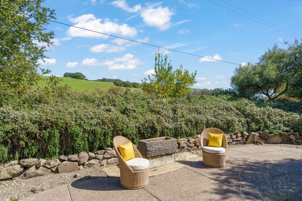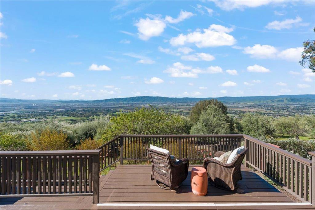 Nestled on 10 private acres, this exceptional estate offers sweeping valley and city-light views from Gilroy to Morgan Hill, AND, it backs up to the pristine hills of the Harvey Bear County Park. The property includes a 4498 sq ft mostly single-level main home and a detached 996 sq ft guest home, providing outstanding flexibility. The serene grounds feature mature olive trees, meandering gold fine paths, scenic look out areas & a tranquil pond. The main residence features a view focused great room, home office with fireplace, music room & exercise room with steam shower. The kitchen has been beautifully remodeled and has deck access for your morning coffee. The luxurious primary suite with fireplace has also been remodeled, with a sumptuous bath with free standing tub, double shower, walk-in closet, & deck access. The home is complemented by new LED lighting, new light fixtures, & gleaming hardwood floors. An expansive deck is ideal for entertaining & relaxing in the spa. The view oriented guest home offers an open living space and kitchen, lovely bedroom and bath, & views from a private deck- an elegant, retreat in a truly special setting. Main home has 50 AM EV charger. GPS not accurate!! Use directions- New Ave to Roop, then turn left onto Estates, right onto Via del Cielo