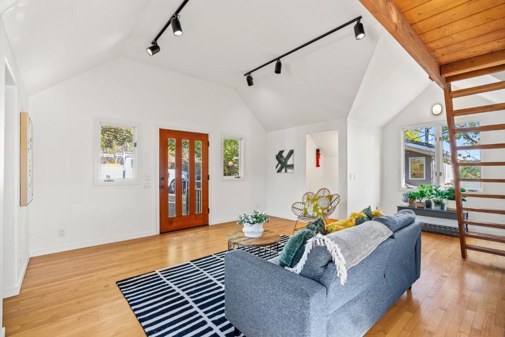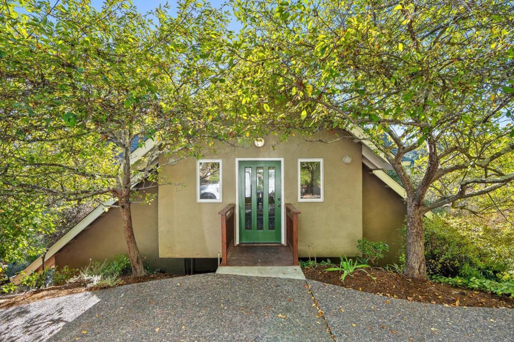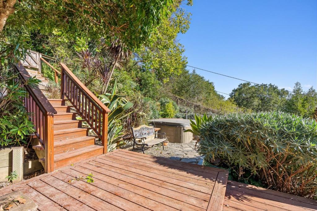 A rare opportunity to enjoy close-in country living just moments from downtown. Nestled above the picturesque San Lorenzo River, this private 1.2-acre sanctuary offers an effortless connection to nature while remaining minutes from every amenity. Gardens, mature trees, & an orchard frame this serene setting, enhanced by expansive decking, a terraced lawn, & a spa area designed for relaxation & entertaining. Panoramic views stretch across the valley to the town below & out to the shimmering bay & mountains beyond. The custom contemporary Craftsman residence showcases vaulted ceilings, skylights, & perfectly positioned windows that capture light & frame the surrounding landscape. The open-concept main level features a kitchen overlooking the dining & living spaces, centered around a fireplace & walls of glass that invite the outdoors in. The lower level has 2 spacious suites each with a private entrance, while two additional bedrooms & a full bath complete the home's thoughtful layout. A detached 2-story garage adds versatility with 2 large finished rooms ideal for an executive office, artist studio, or fitness space. Two driveways & additional parking ensure effortless access. Powered by a solar panel system, this estate blends timeless craftsmanship with modern sustainability.