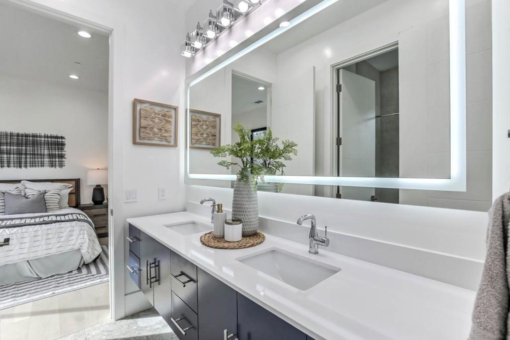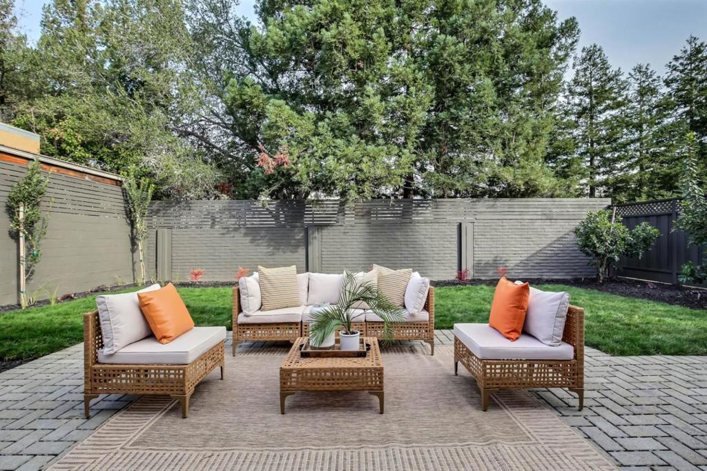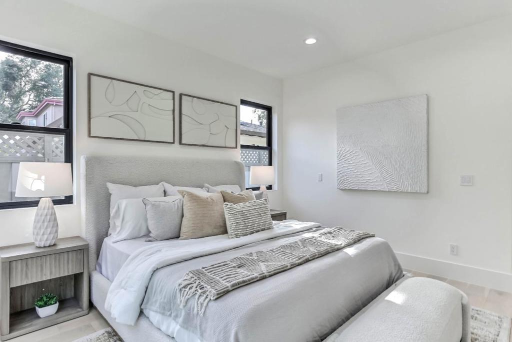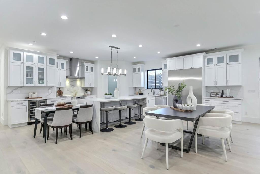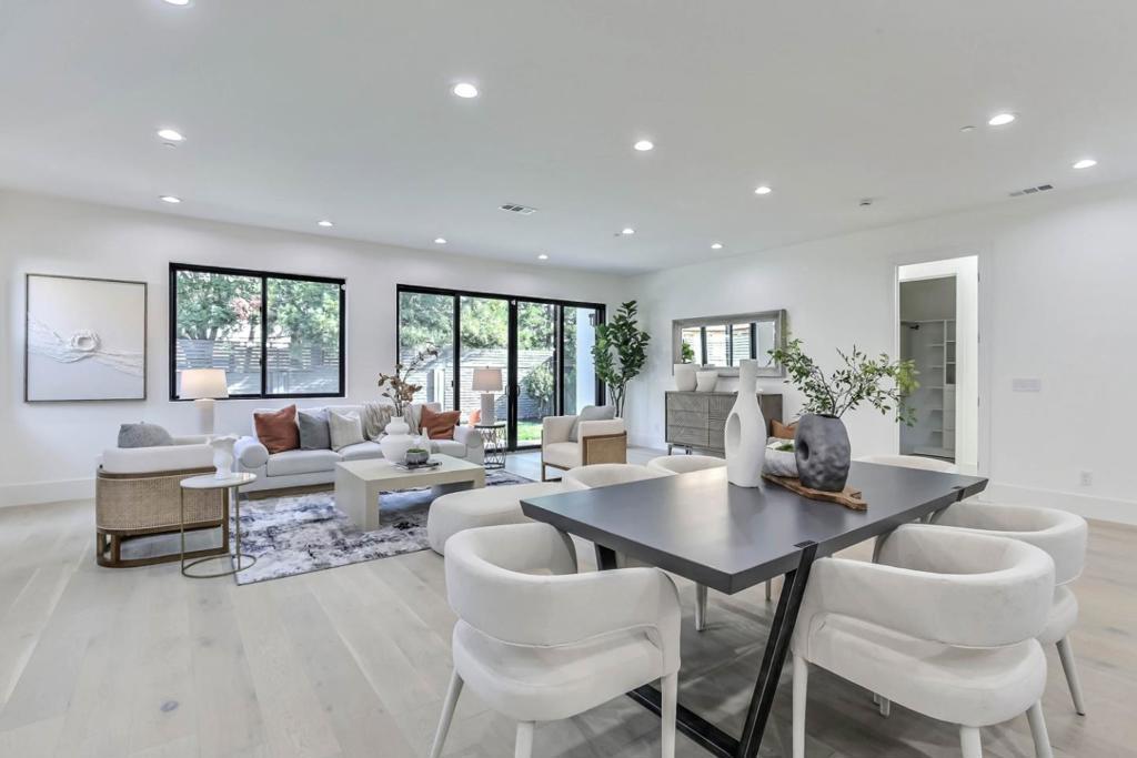 Brand-new single-story home with soaring 10ft coffered ceilings in the highly sought-after Monta Vista neighborhood, near Apples Infinite Loop & Spaceship Campus, major tech hubs, & Hwys 85 & 280. Top-rated schools include Lincoln Elem., Kennedy Middle, & Monta Vista High. A travertine-tiled covered porch & dramatic 6x8 double wrought iron front door create a striking entry. Inside features wide-plank engineered hardwood floors, recessed lighting, modern interior doors, tall Andersen double-pane windows, & hall closets. Open-concept living & dining areas showcase an electric fireplace with porcelain floor-to-ceiling slab mantel. The gourmet kitchen offers a waterfall island with Quartz Calacatta Casa countertops, matching slab backsplash, custom cabinetry, glass-front uppers, pendant lighting, walk-in pantry, & premium Thermador appliances including refrigerator & freezer columns, electric cooktop, wall oven, drawer microwave, & dual-zone wine cooler. The primary suite includes backyard access, walk-in closet, & spa-style bath with soaking tub, walk-in shower, floating double vanity, & water closet. Additional highlights include Sunrun 4.46kW solar with battery, Rachio irrigation, landscaped backyard with pavers & patio, epoxy-floored two-car garage, & smart-home automation.