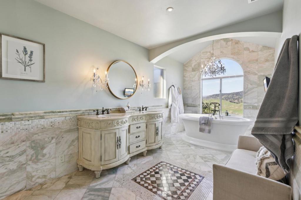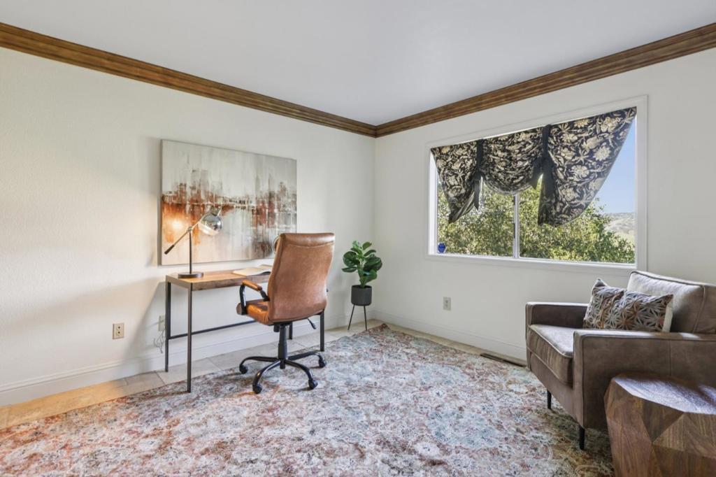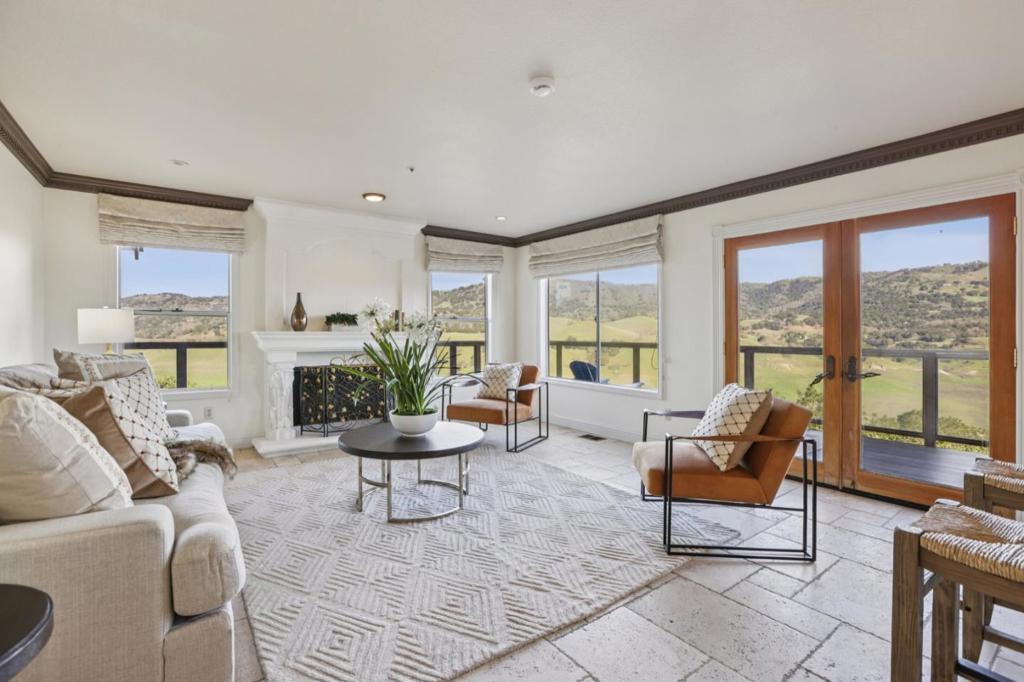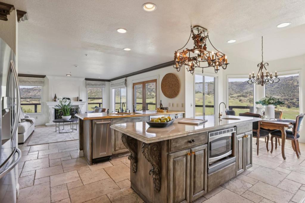 Gated Tuscan-inspired estate in desirable Holiday Lake Estates, set on nearly an acre with sweeping hillside and valley views. This custom home features soaring ceilings, imported Italian travertine floors, crown molding, hand-painted murals, and multiple fireplaces. Chefs kitchen with Carrara marble island, stainless steel appliances, and custom backsplash opens to expansive entertaining spaces. Spacious primary suite offers 15-foot ceilings, fireplace, sitting area, walk-in closet, and spa-style bath with onyx counters, Jacuzzi tub, and rain shower. Private guest suite with full bath. Approx. 1,000 sq. ft. custom wine cellar with 11-ft ceilings (not included in square footage). Multiple outdoor patios and courtyard ideal for entertaining, with room for a future pool. Three-car garage, indoor laundry, and peaceful setting near hiking trails. A rare hillside retreat minutes from downtown Morgan Hill. An Entertainers Estate with Panoramic Views.