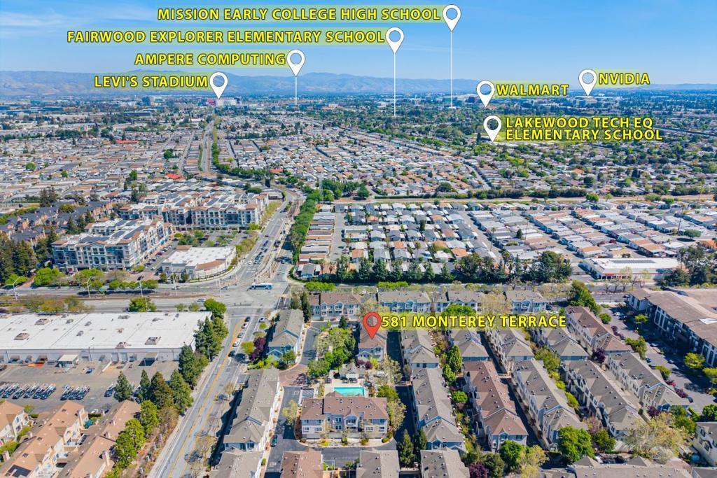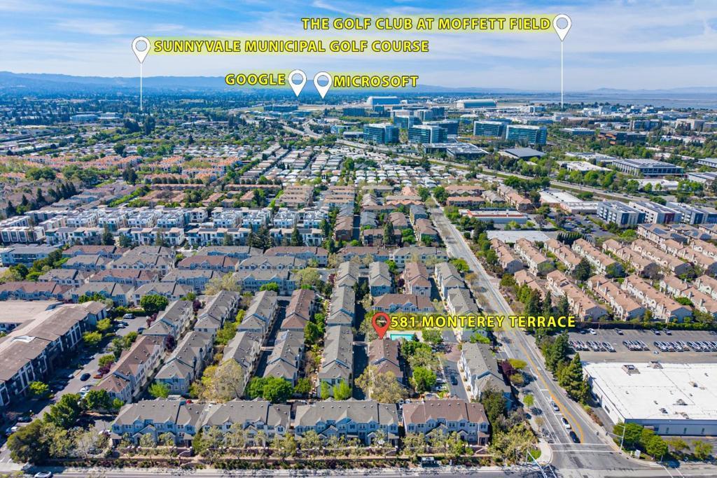 Welcome to 581 Monterey Terrace, a bright, move-in ready end-unit home in the heart of Sunnyvale. North-facing and bathed in natural light, it is one of the few homes with open green space out front, creating privacy and a rare connection to nature in this Silicon Valley townhome community. Walk or bike to nearby tech campuses like Google, Meta, Amazon, Apple, LinkedIn, Walmart, Juniper Networks and Alibaba, with private corporate shuttles serving the area. The home enjoys a prime corner position, offering abundant light and an open, airy atmosphere. A versatile bonus space on the lower level ideal for a home office, gym, creative studio or home theater is not included in the recorded square footage, offering flexibility and added value for todays modern lifestyle. The prime central location offers unparalleled convenience: minutes from major freeways, San Jose International Airport, Levis Stadium, Great America, and the scenic Baylands Park, offering abundant options for dining, sports, and outdoor recreation. Steps from Arwa Yemeni Coffee and close to Fair Oaks Light Rail station, this location blends vibrant urban energy with everyday ease. A rare opportunity to own a bright, functional, and well-located home in one of Silicon Valleys most connected communities.