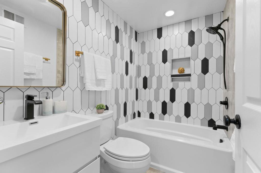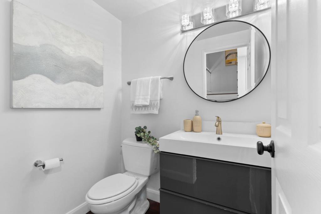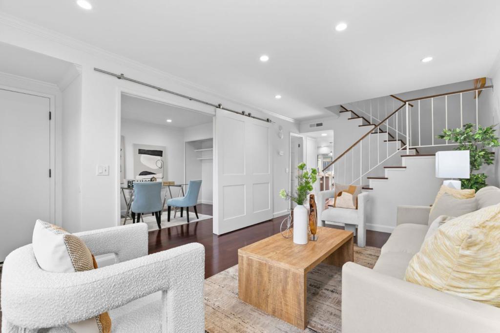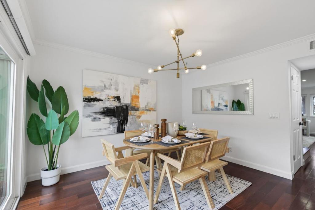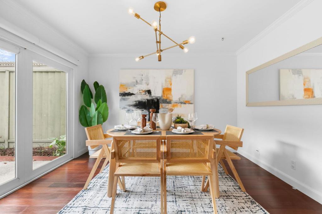 Bright and spacious two-story townhouse in one of the communitys best locations, overlooking the greenbelt. The main level features a generous living room, a versatile den that can serve as a bedroom or office, and a fully updated kitchen with custom cabinetry, quartz countertops, and high-end Bosch Benchmark appliances. The adjacent dining area opens to a private backyard patio, perfect for entertaining. Upstairs, the grand primary suite offers a spa-like bath with dual sinks and a large walk-in closet, while two additional bedrooms share a full hall bath. Additional features include wood flooring throughout, a first-floor powder room, laundry room with washer and dryer, dual-pane windows, and a spacious two-car garage with ample storage. Enjoy resort-style amenities and a prime location in walking distance to seven parks, playgrounds, top-rated schools, The Bay Trail, restaurants, and the Ranch 99 shopping center.