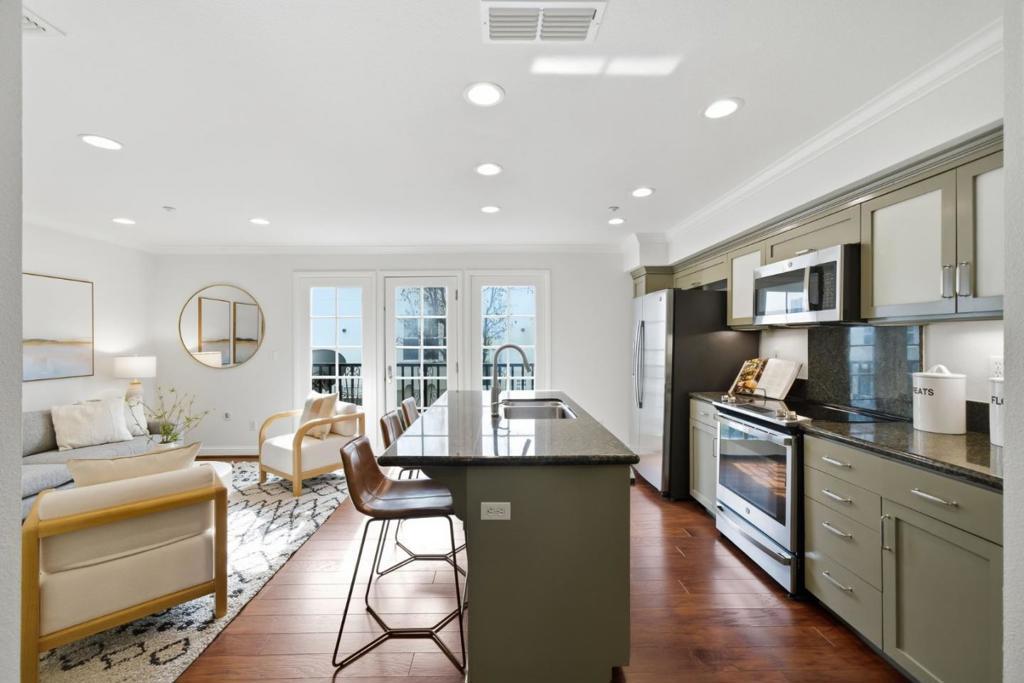 Move right in to this turn-key 3-bedroom, 2.5-bathroom townhome offering 1,697 square feet of thoughtfully designed living space, steps from Ryland Park and minutes from downtown San Jose. The split-level layout impresses from entry, with a soaring double-height living room, floor-to-ceiling picture windows, and rich hardwood floors throughout. The open-concept kitchen features sage green cabinetry, granite countertops, a large island with sink and bar seating, stainless steel appliances, and seamless flow into the dining area and family room. A private front deck offers a quiet outdoor retreat overlooking the park. Upstairs, the primary suite includes a generous walk-in closet and en-suite with double vanity, soaking tub, and walk-in shower. Two additional bedrooms and a versatile upper-level lounge provide flexible space for any lifestyle. Energy-efficient double-pane windows, central AC and heating, in-unit laundry, and an attached two-car garage complete the package. Located in the San Jose Unified School District with easy access to Light Rail, Highways 87 and 280, and San Jose International Airport.