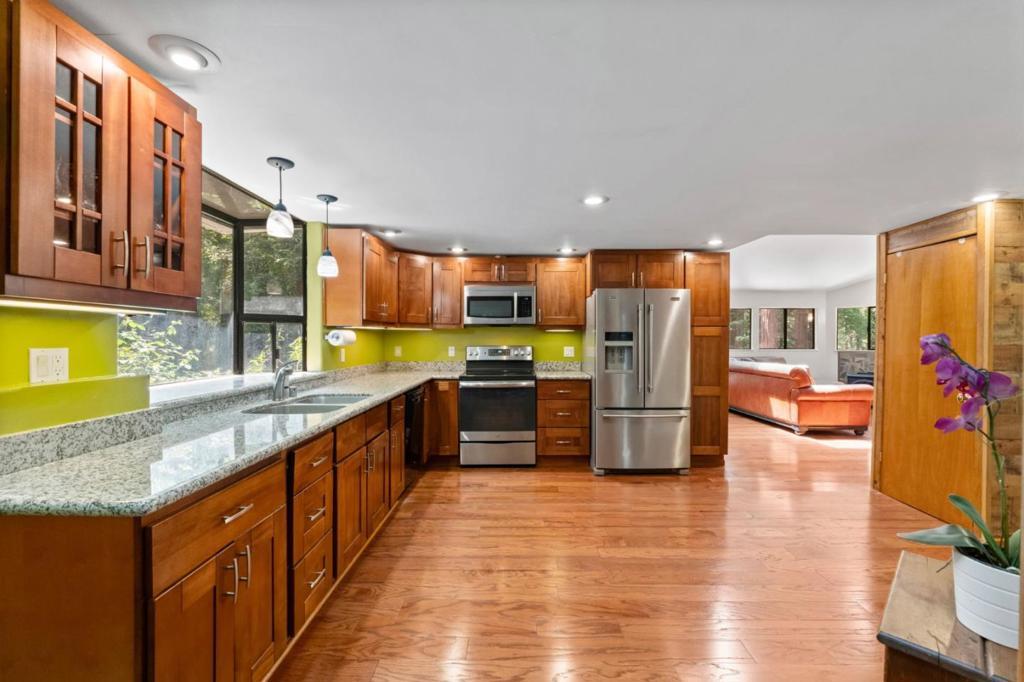 This property is a true redwood retreat - private, peaceful, and turnkey ready. Whether you're looking for a full-time residence or a weekend getaway, 483 Echo Lane delivers the best of mountain living with modern luxury. Amenities include granite countertops, stainless steel appliances, including French-door fridge and built-in microwave, large bay window over the sink offering immersive forest views, recessed and pendant lighting for a bright, inviting workspace, vaulted ceiling with skylights offering natural light and ventilation, custom walk-in shower with glass enclosure and relaxing soaking tub, private deck access and serene views, beautiful engineered hardwood flooring connects each room seamlessly, elevated decks surround the home, nestled among towering redwoods offering both shade and privacy, multilevel terraced yard with ample outdoor living areas, separate studio building great for remote work space, yoga/art studio or bring your imagination, 500 gallon propane tank onsite, washer and dryer in furnace room and main house, stand by generator turns on automatically when there is a black out, collection site for garbage is just down the street from the property, as well as mailbox, 2 parking spots.