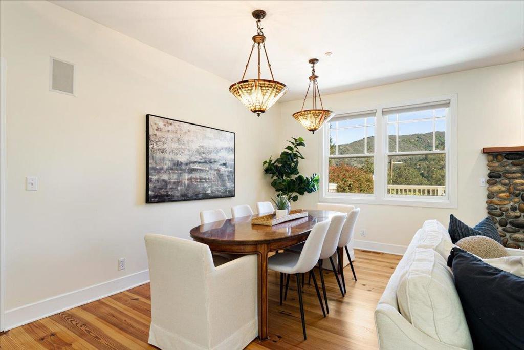 Experience privacy, open space, and sweeping meadow and mountain views on approximately 7.45 acres in the Los Gatos Mountains. Built in 2000, this Craftsman-style 4-bedroom, 2.5-bath home offers approximately 2,838 square feet of light-filled living space just minutes from downtown Los Gatos. The main level features wide plank pine floors, skylights, and two wood-burning fireplaces. The open kitchen and family room include a gas cooktop and island, creating an ideal layout for everyday living and entertaining. Two bedrooms and 1.5 baths are located on the ground floor, along with a spacious laundry/mudroom. Upstairs, the primary suite includes a private balcony with meadow and mountain views, walk-in closet, and bath with soaking tub and separate shower. A fourth bedroom and large bonus room provide flexible space for office, media, or guest use. Outdoor living includes a covered front porch, patio with outdoor fireplace, outdoor kitchen, fenced yard, raised garden beds, and mature fruit trees. Detached 3-car garage with additional open/RV parking. Well water with storage tank, septic system, and propane on site. A rare combination of acreage, views, privacy, and proximity to Los Gatos within the Los Gatos school districts (buyer to verify). Fireplace photos include an AI fire.