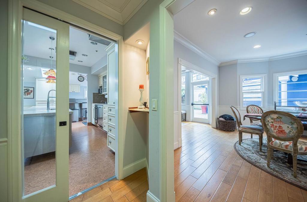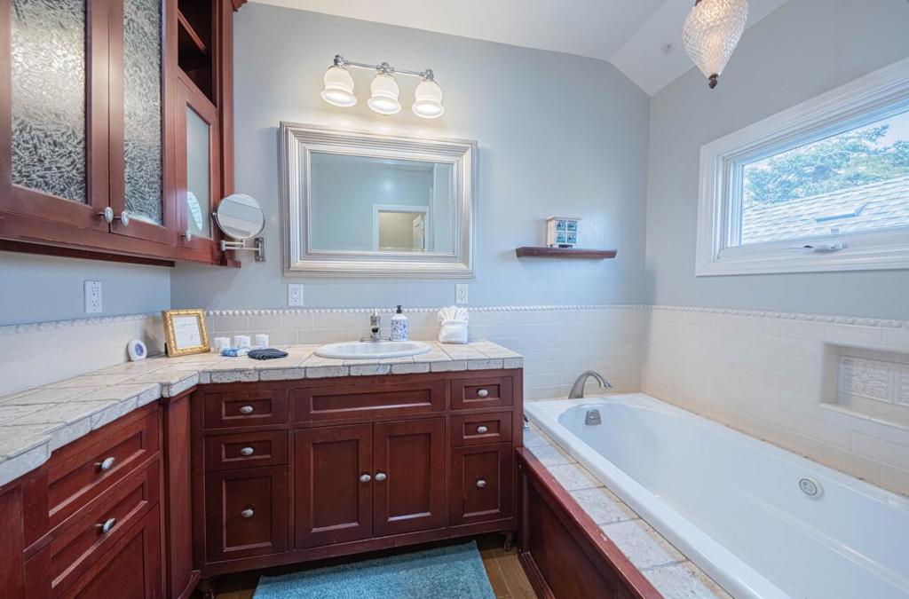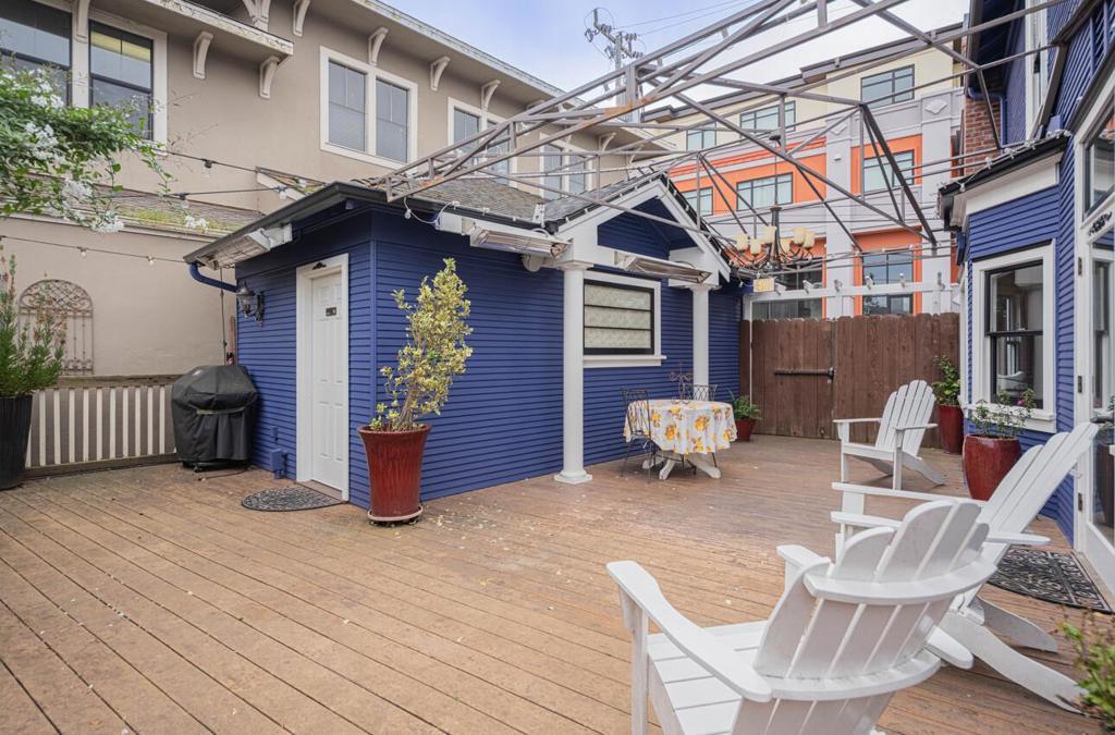 Just 1 ½ blocks from Lovers Point and the sparkling Pacific Ocean, this Downtown Pacific Grove gem captures the essence of coastal living. Offering 3 bedrooms, 3 baths and approx. 2,100 sq ft, the home features rich hardwood floors, beautiful woodwork, formal entry, expansive dining room, and both living and family rooms designed for gathering. The chefs kitchen shines with stainless appliances, large island, custom cabinetry, built-in settee, and wine refrigerator. Stackable washer/dryer included and conveniently located upstairs near the bedrooms and bathroom. Step outside to a spacious deck with built-in fireplace, and twinkling string lightsperfect for unforgettable evenings. All bedrooms are upstairs. Basement storage, attic access, detached 1-car garage, driveway, and off-street parking. Currently used as a short-term rental; ideal as a primary residence or coastal retreat (buyer to verify).