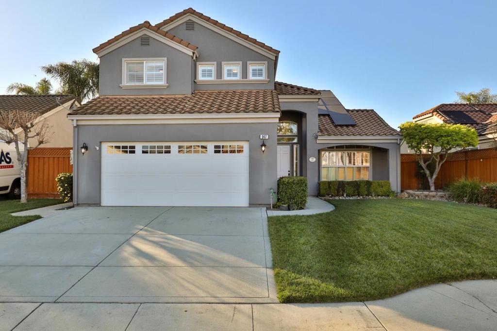 Discover the charm of Morgan Hill in the sought-out Oak Creek Park Neighborhood! This spacious 2,254 sq ft home, thoughtfully designed to accommodate modern living. This residence features 4 bedrooms and 2.5 bathrooms, including a large primary suite complete with a walk-in closet and oversized bathroom. The updated kitchen offers a gas cooktop, quartz countertops, double ovens, and stainless-steel appliances. Adjacent, the dining area provides versatile options with a breakfast bar and eat-in kitchen. The separate family room is perfect for gatherings, complemented by a cozy fireplace. New wood flooring downstairs brightens the home even more with all the natural light this home has to offer. Bathrooms boast double sinks, a shower and tub, and a primary suite with a stall shower and jetted tub. Amenities such as a vaulted ceiling and high ceiling enhance the spacious feel. Practical features like central AC, ceiling fans, plantation shutters and owned solar power improve comfort and efficiency. Conveniently, the inside laundry area offers gas and electricity hookups. When not in the home, enjoy the 3-acre park at the end of the court with playgrounds, tennis court, basketball court, horseshoes and picnic area. No HOA fees in this neighborhood! Must see to appreciate!