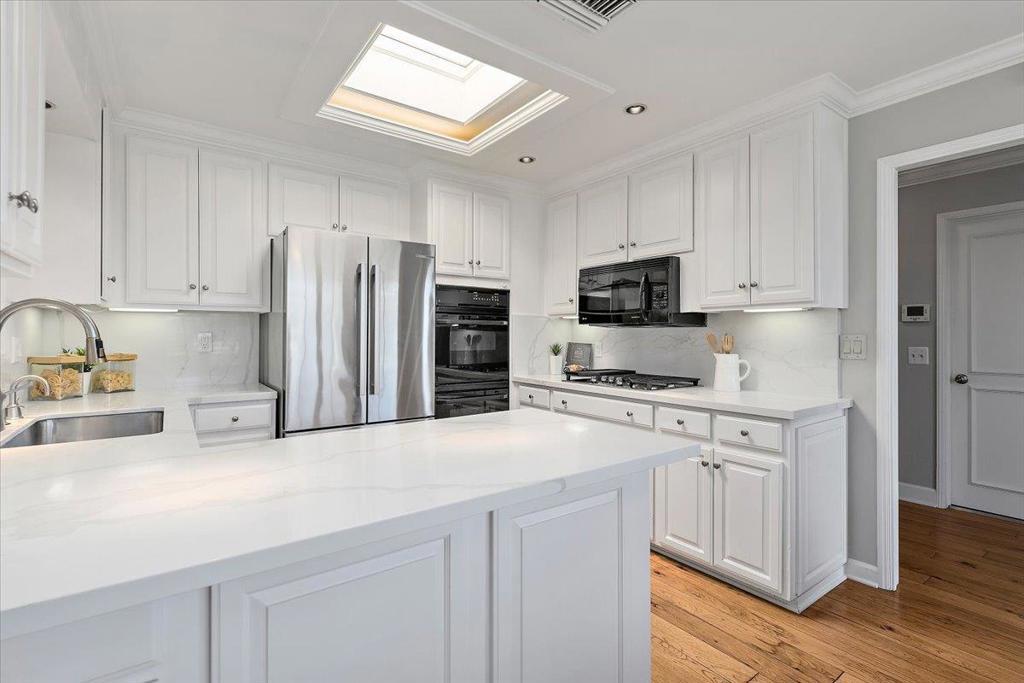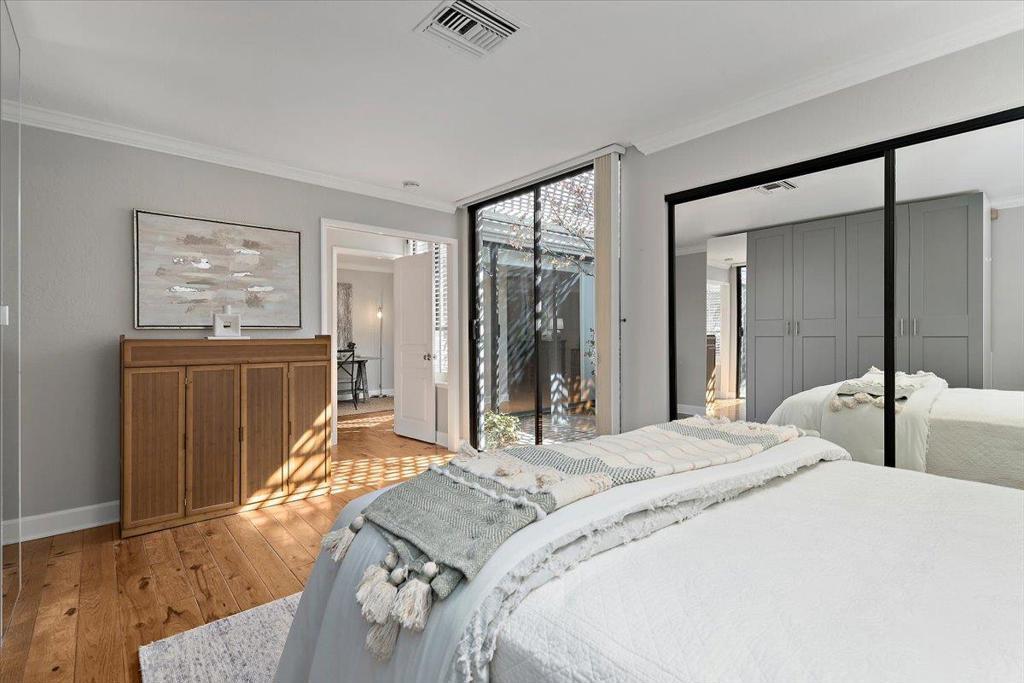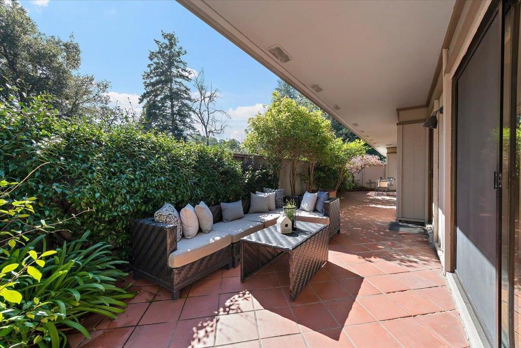 Arrive through the gates of prestigious Creekside Oaks and be welcomed by a serene grotto-style pond and fountain that instantly sets a tone of tranquility. This beautifully maintained community offers resort-style amenities including two pools, spa, and bocce court surrounded by lush landscaping. This coveted single-level 2BR 2BA + office home offers approx. 1,840 +/- SF with warm hardwood floors and a private outdoor atrium with trees and flowers visible from nearly every room. The remodeled kitchen features white quartz countertops, top-of-the-line stainless appliances, and a bright morning-sun breakfast nook with large windows and classic Boston shutters. The formal dining room opens to a tiled patio stretching along the home, perfect for indoor-outdoor entertaining or relaxing evenings. Skylights and multiple sliding glass doors fill the home with natural light. The spacious primary suite offers patio access, dual closets, and a private bath with separate tub and shower plus serene atrium views. Convenient access to Hwy 280 provides quick connections to downtown Los Altos, shopping, dining, parks, and major Silicon Valley employers, making daily living both comfortable and convenient in this desirable Los Altos location.