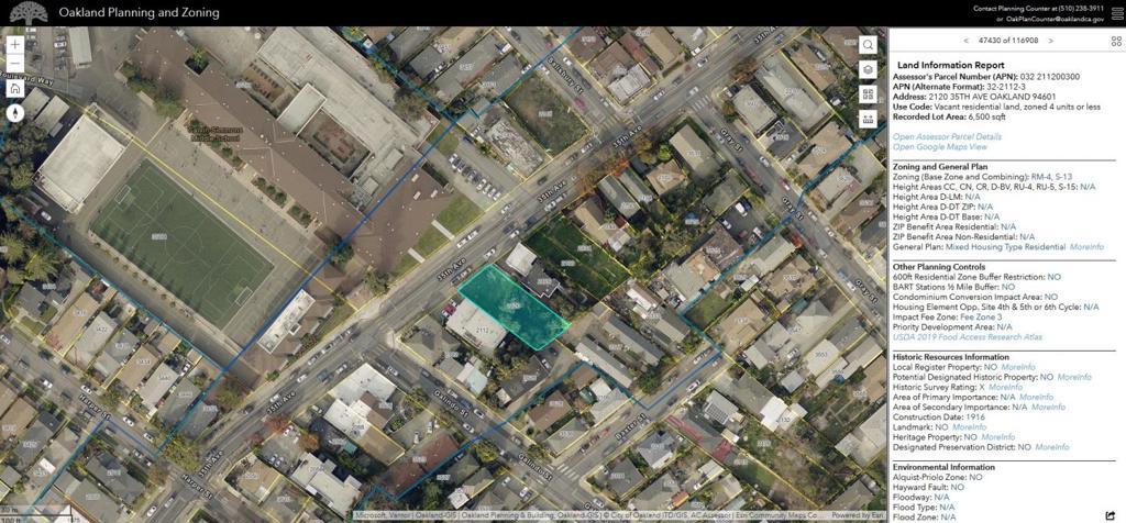 Rare opportunity to built 4-6 units plus s-13 bonus zoning (for 2 additional floors) and possible ADU in Oakland's Harrington neighborhood. The lot is up-slope at the front, reaching near level at the back half, allowing for stepped building of multi-unit. There is a potential for views from upper floors.
