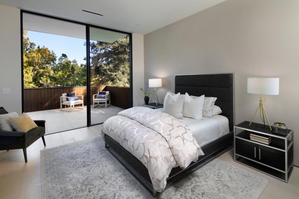Just completed, this 3-level modern masterpiece is the crown jewel of Menlo Park. Built by Mason Hammer Builders, the all-electric, solar-powered home showcases imported European materials from Italian cabinetry and doors to French lighting and Swiss windows. A detached guest house/ADU offers space for extended family or todays evolving needs. The main home is also designed for multi-generational living with 7 bedroom suites (one staged as an office) across all levels served by an elevator, a fitness center with steam shower bath, a theater, and multiple lounges. Expansive glass doors retract open to porcelain-tiled terraces, a pool and spa, outdoor shower, poolside bath, and barbecue kitchen, all on approximately one-third acre of eco-friendly grounds. A one-of-a-kind home in the most sought-after neighborhood. Main residence 6885 SF; ADU/Guest House 772 SF + Garage 445 SF = total of all structures 8102 SF. Excellent Menlo Park schools and minutes to Stanford University.
